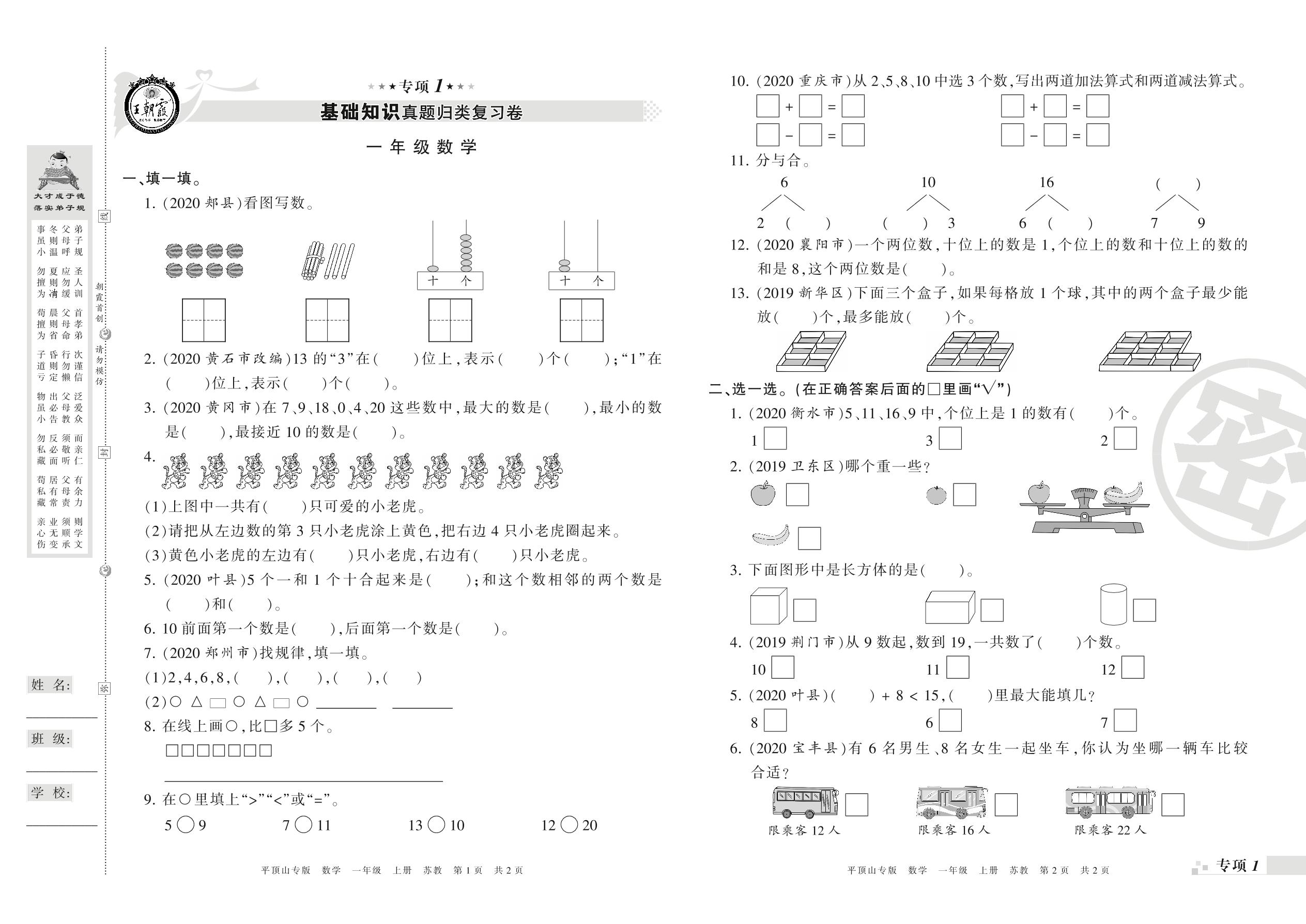 王朝霞期末专项卷——基础知识、计算真题归类复习一年级上册数学(苏教版)_R210802211336【0】