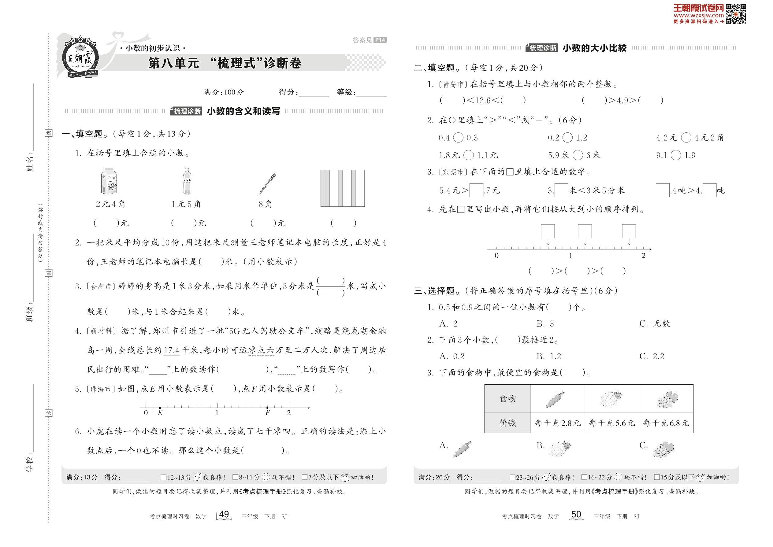 2023下册三年级数学苏教版 第八单元 “梳理式”诊断卷