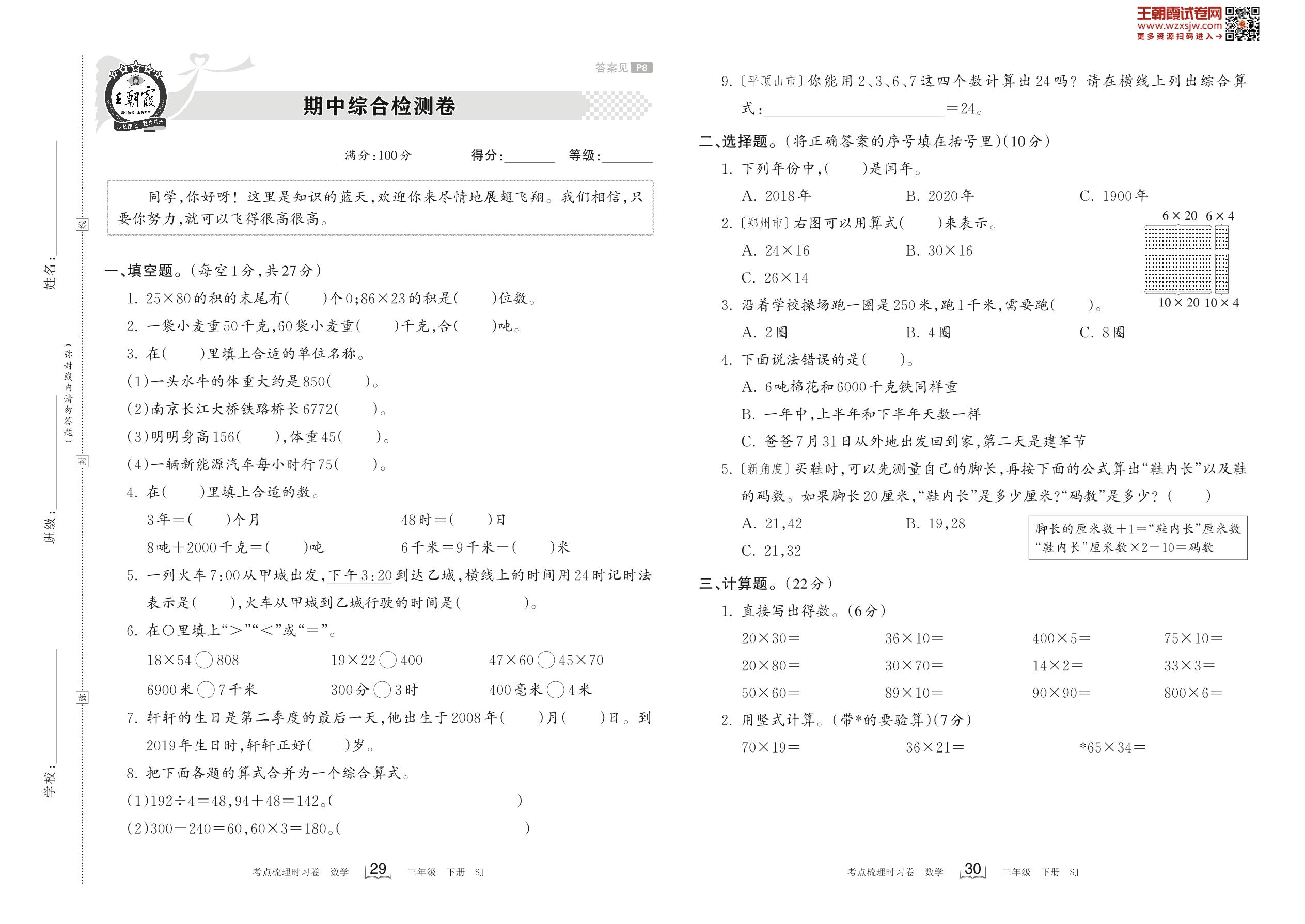 三年级数学苏教版下册期中卷