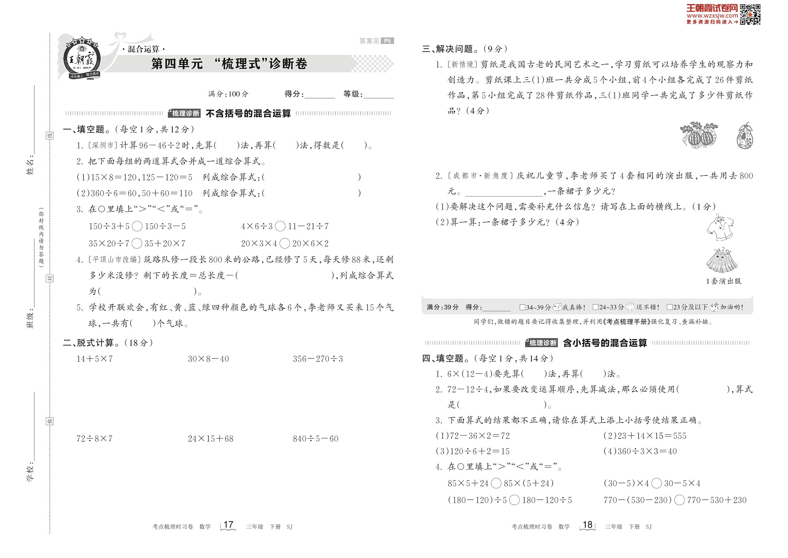 2023下册三年级数学苏教版 第四单元 “梳理式”诊断卷