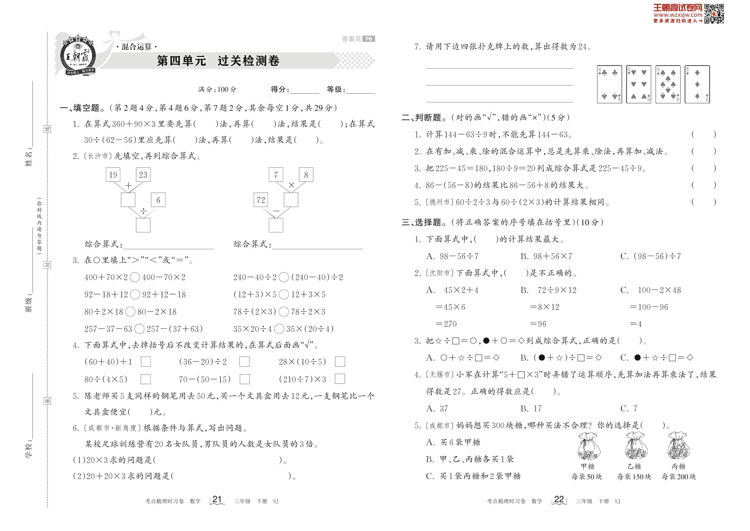 三年级数学苏教版下册单元卷