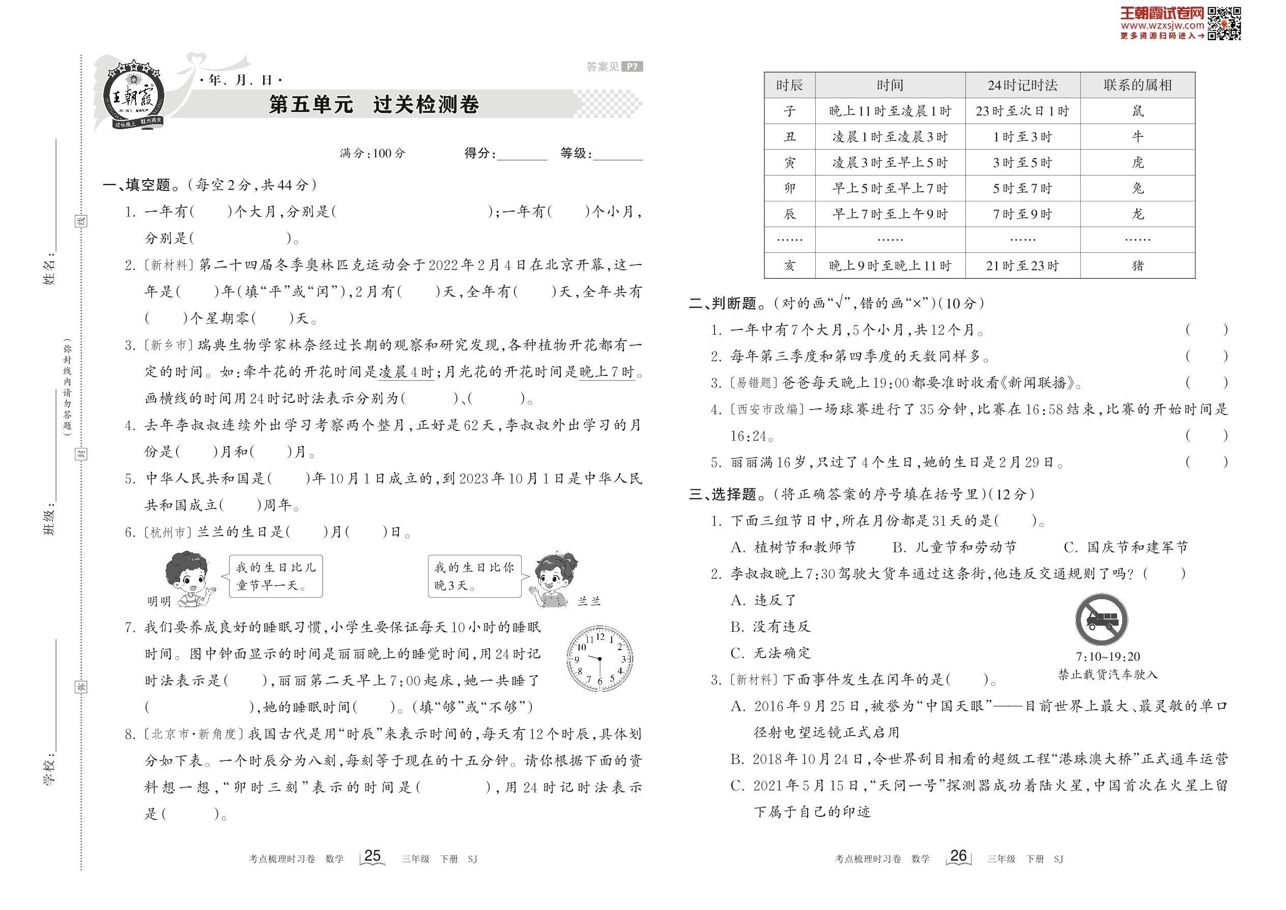 2023下册三年级数学苏教版 第五单元 过关检测卷