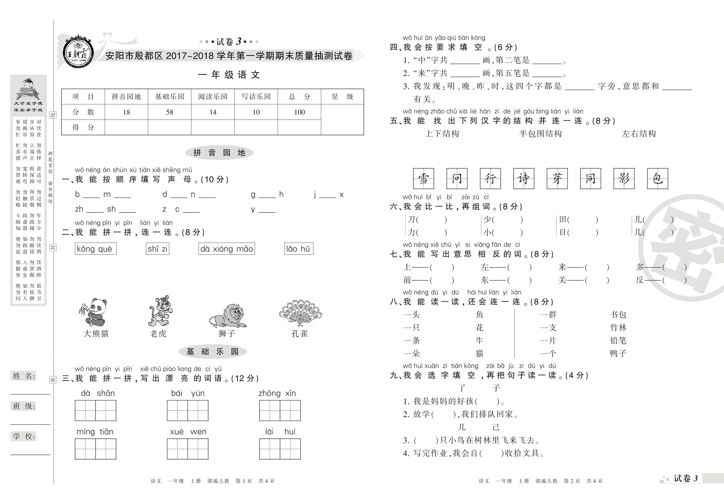 2017-2018学年第一学期安阳市殷都区一年级语文试卷(人教版)【3】