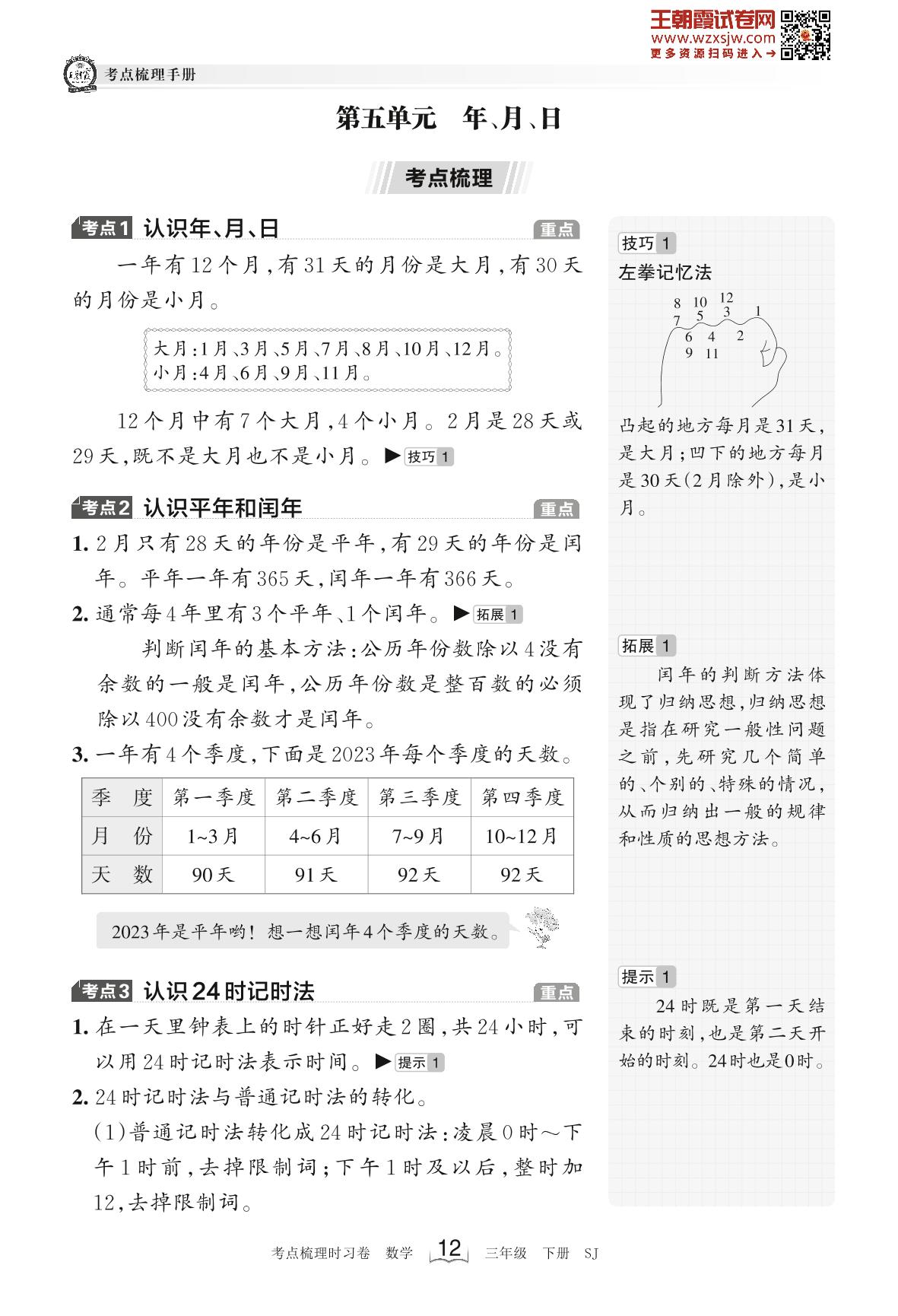 2023下册三年级数学苏教版 考点梳理手册——第五单元 年、月、日