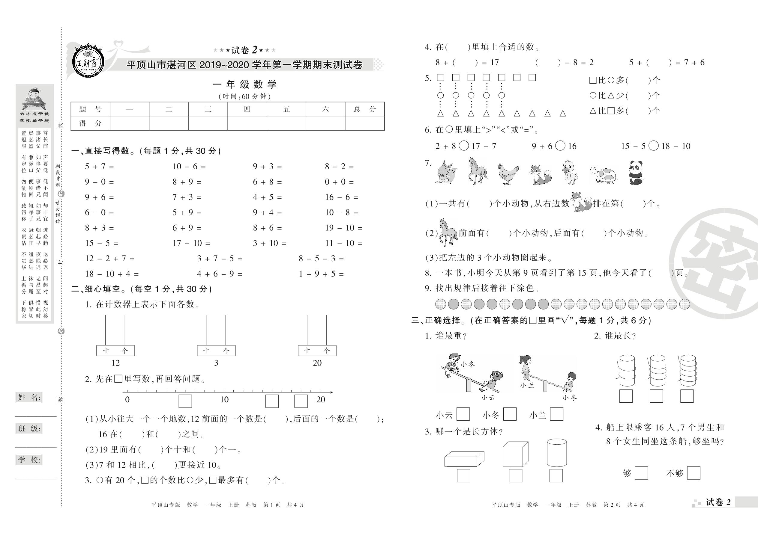 2019-2020学年第一学期平顶山市湛河区一年级数学试卷(苏教版)_R210802211346【2】