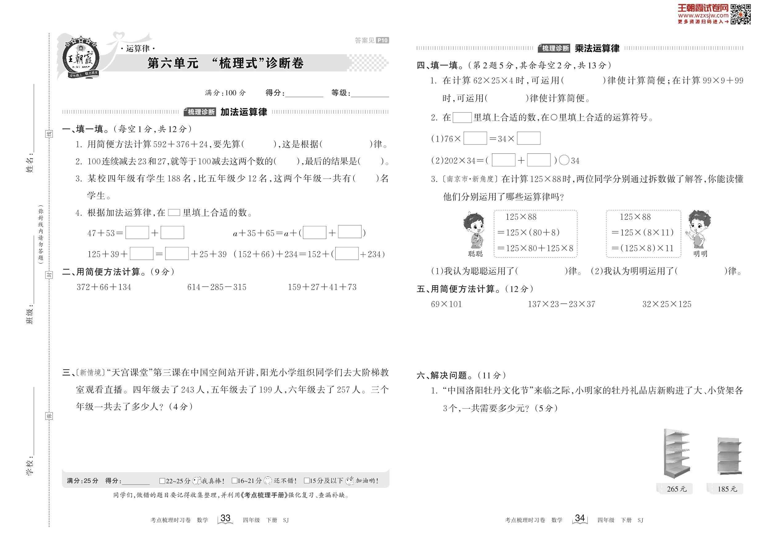 2023下册四年级数学苏教版 第六单元 “梳理式”诊断卷