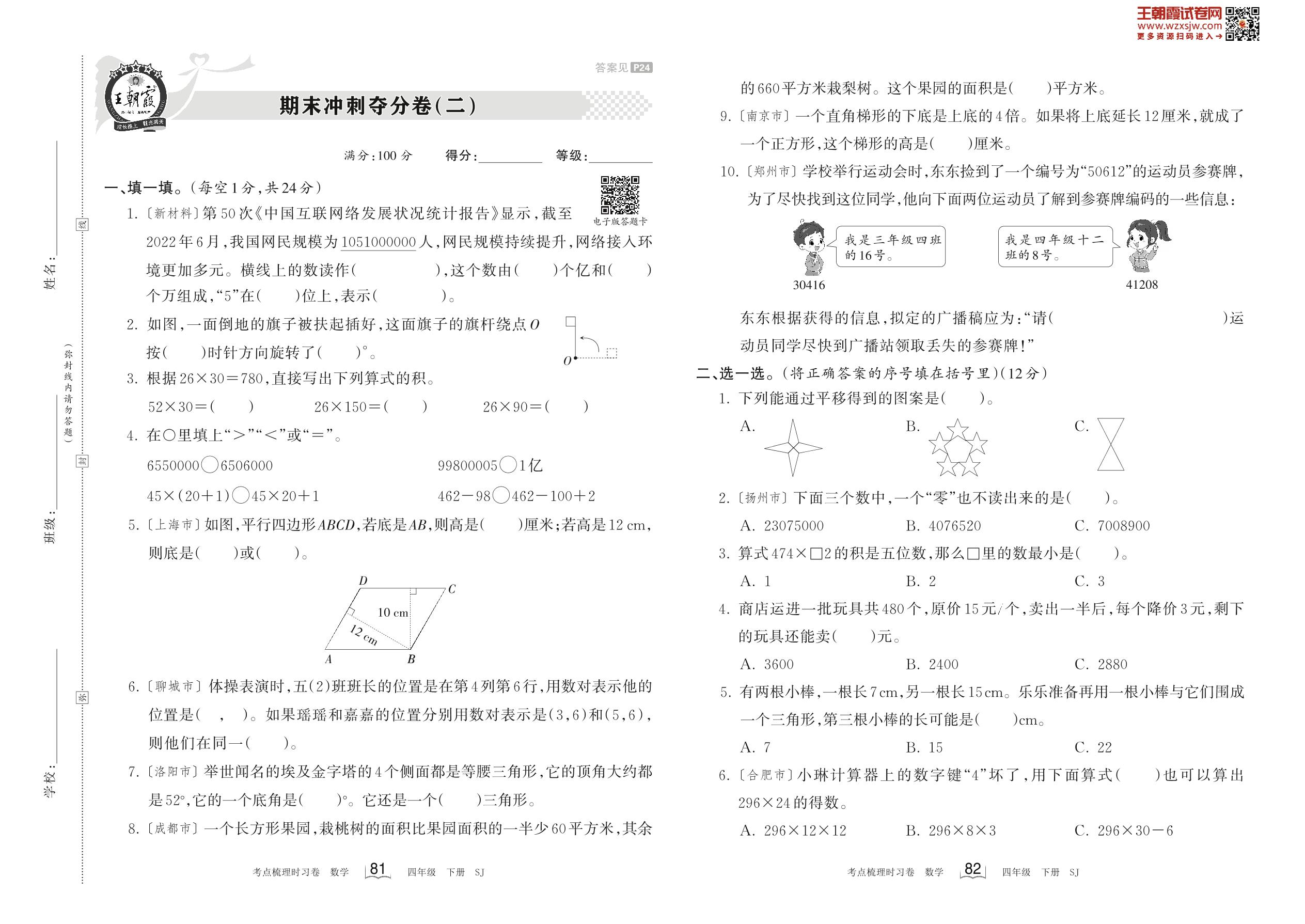 2023下册四年级数学苏教版 期末冲刺夺分卷(二)