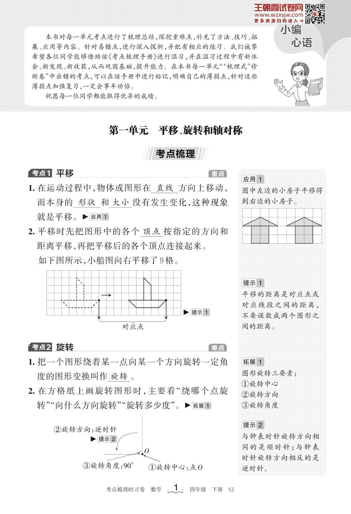 2023下册四年级数学苏教版 考点梳理手册——第一单元 平移、旋转和轴对称