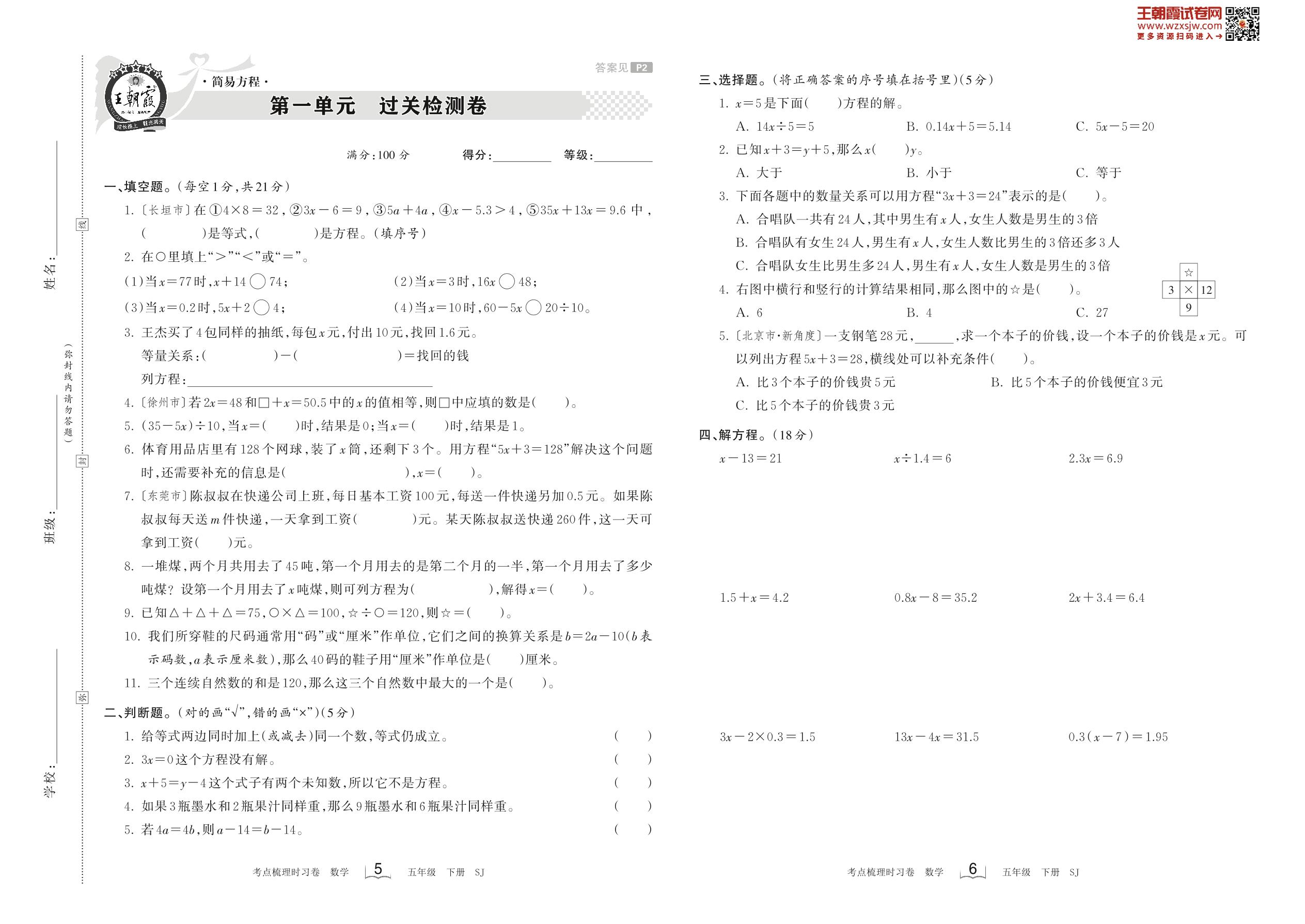 五年级数学苏教版下册单元卷