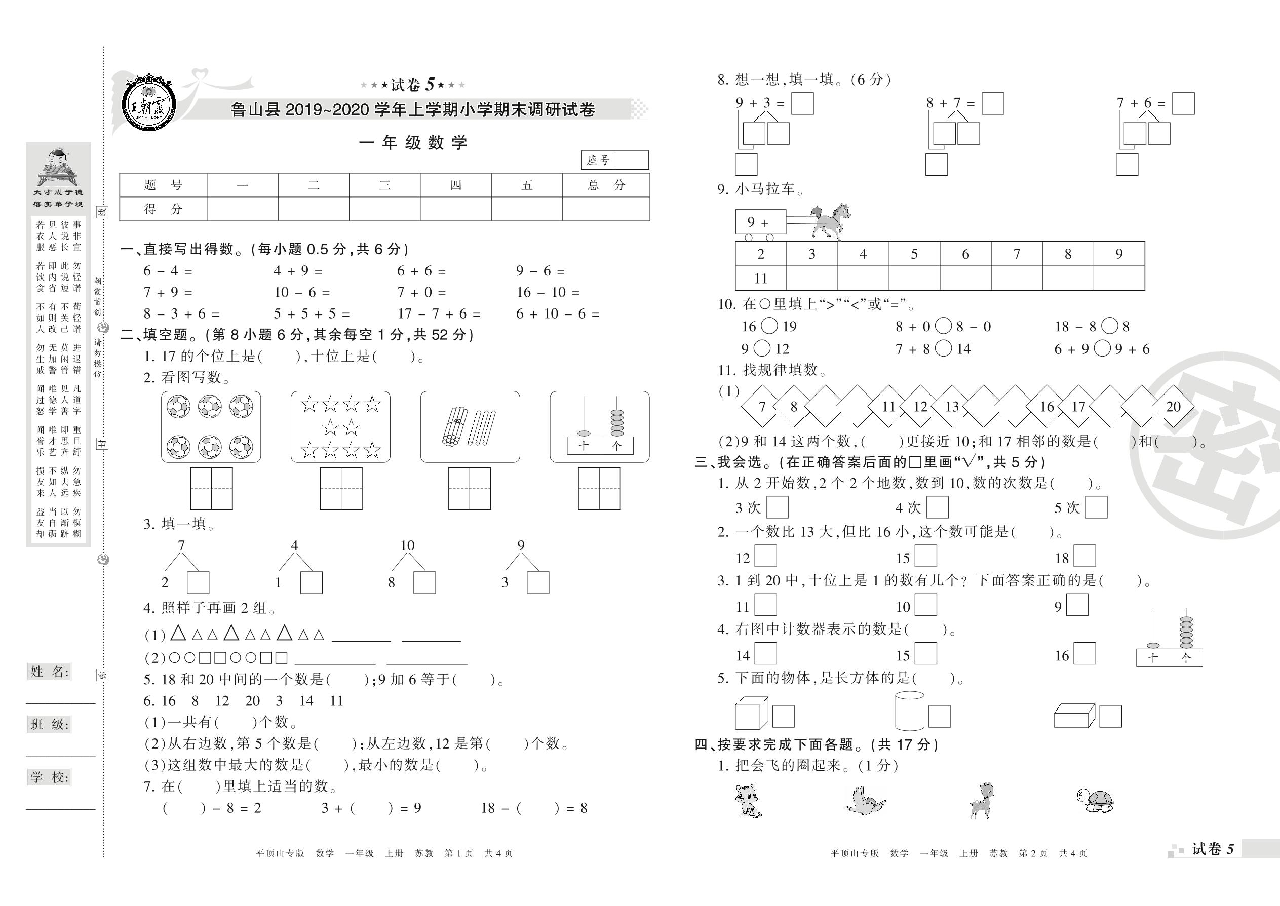 2019-2020学年第一学期平顶山市鲁山县一年级数学试卷(苏教版)_R210802211357【5】