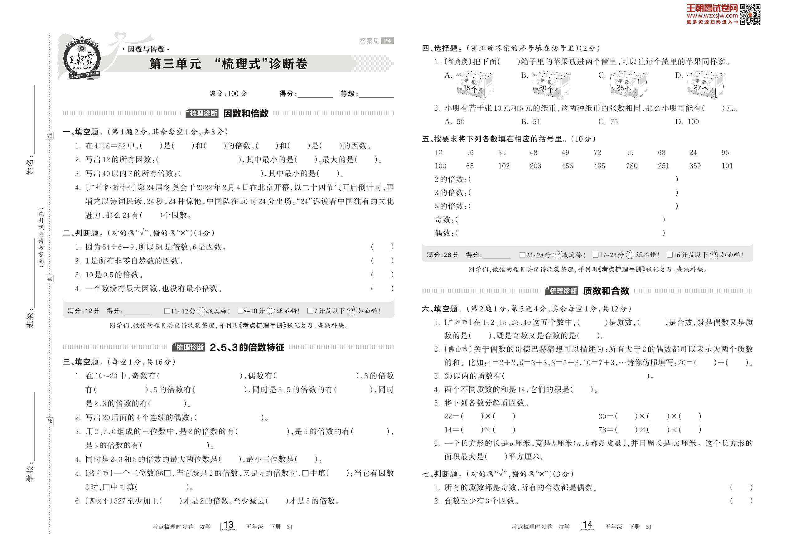 2023下册五年级数学苏教版 第三单元 “梳理式”诊断卷