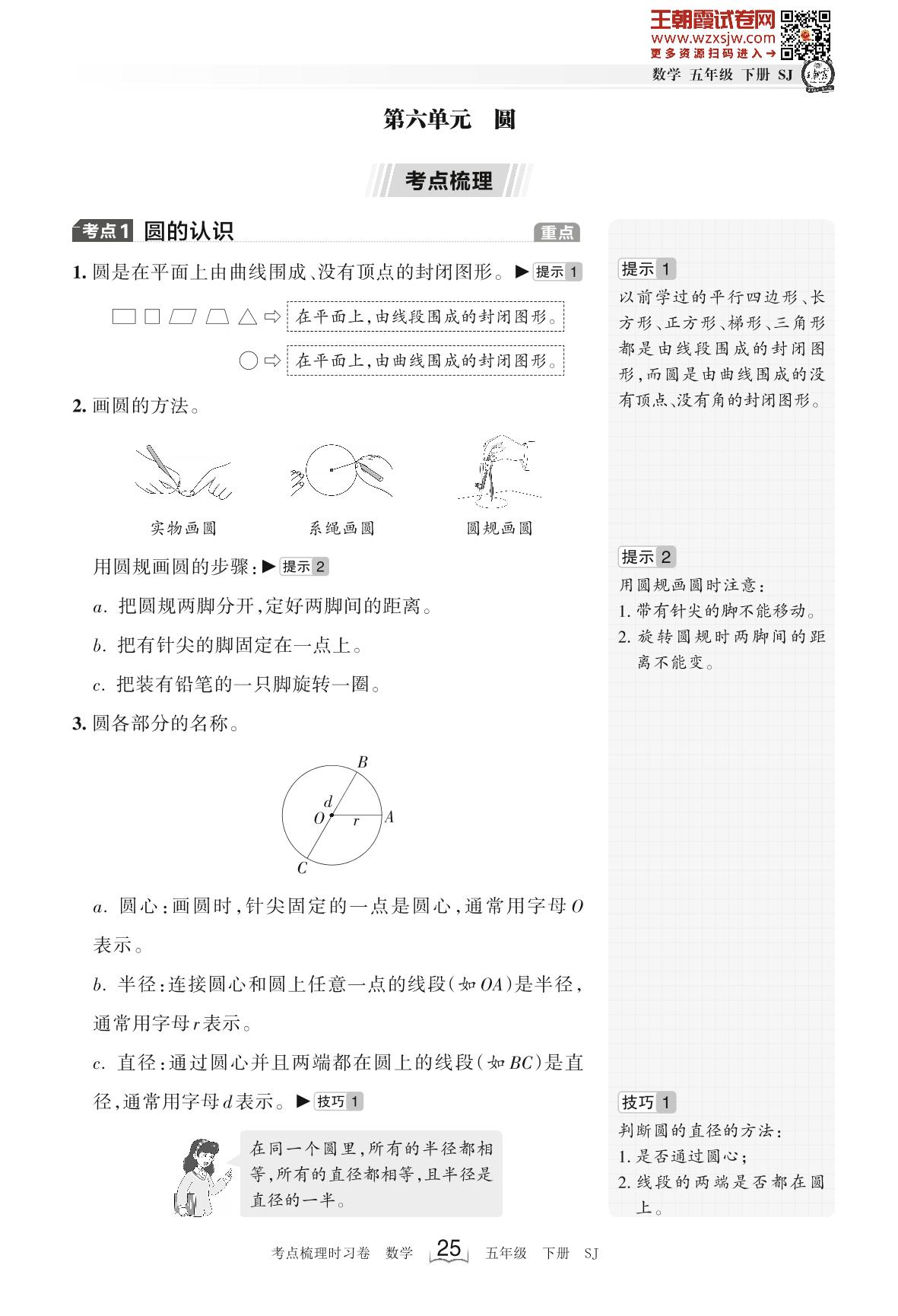 2023下册五年级数学苏教版 考点梳理手册——第六单元 圆