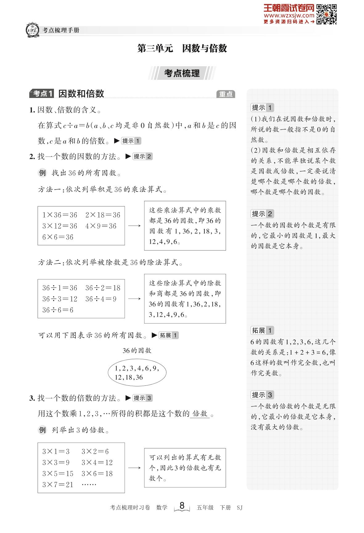 2023下册五年级数学苏教版 考点梳理手册——第三单元 因数与倍数