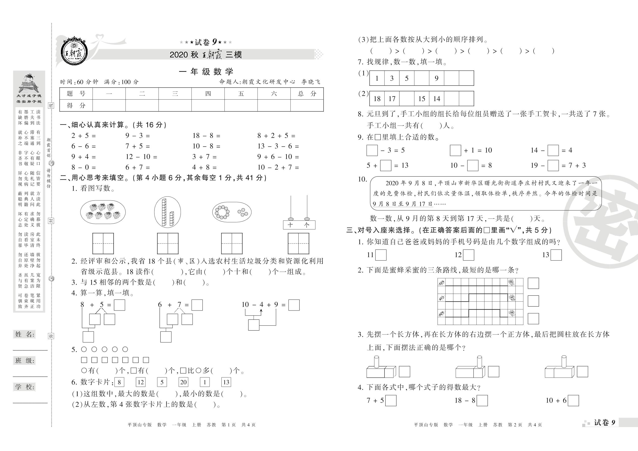 王朝霞期末模拟卷一年级上册数学(苏教版)_R210802211412【9】