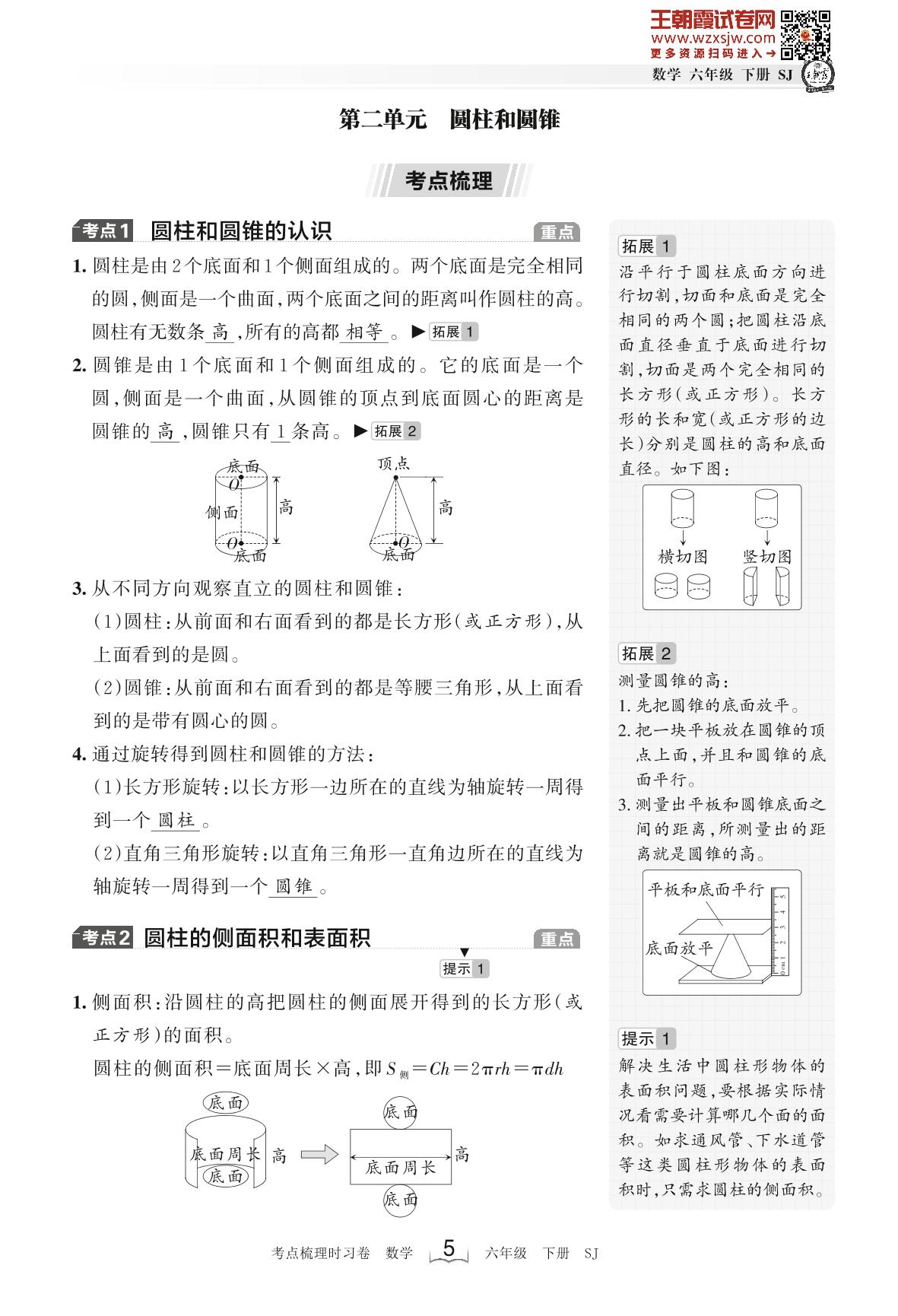 2023下册六年级数学苏教版 考点梳理手册——第二单元 圆柱和圆锥