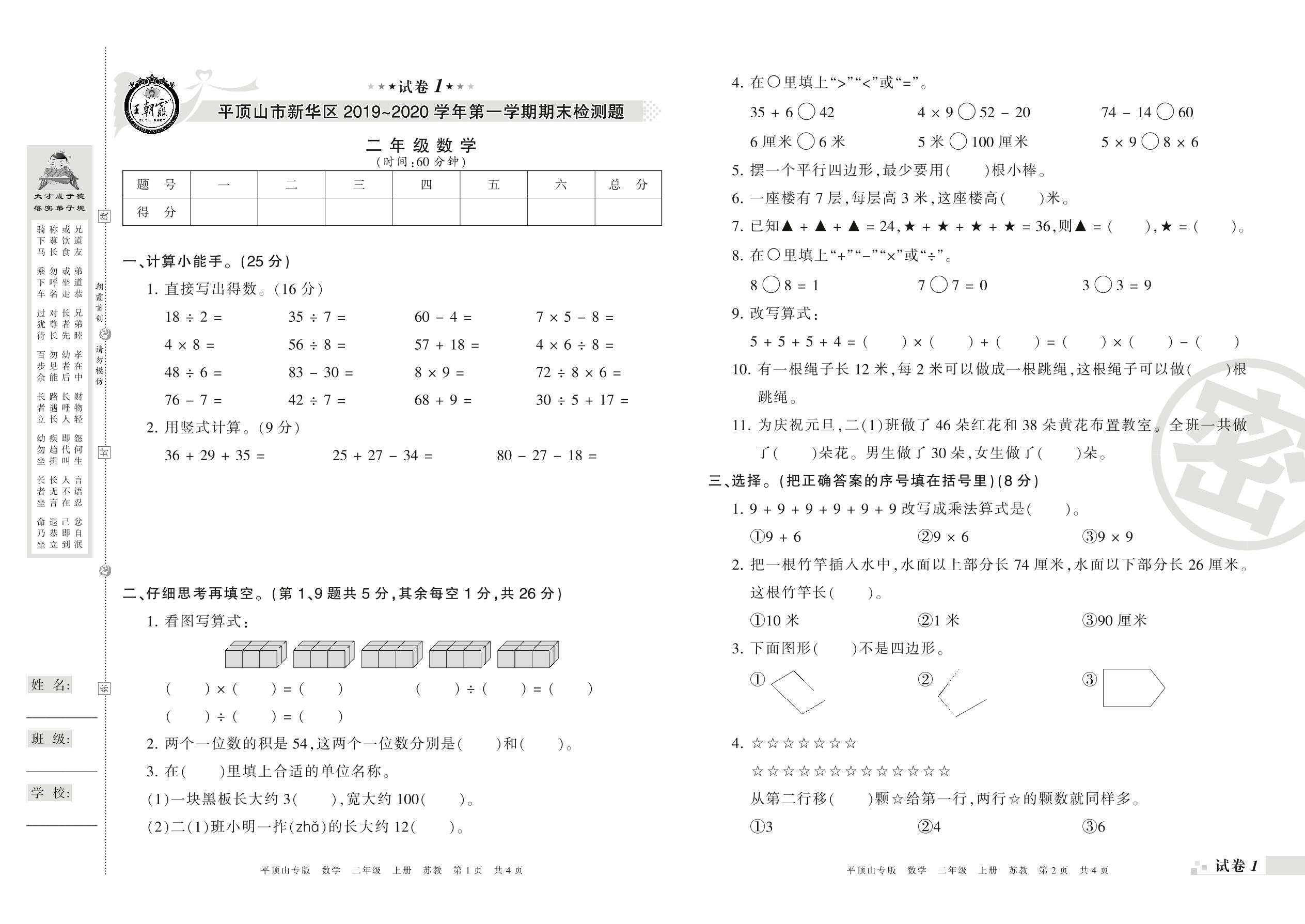 2019-2020学年第一学期平顶山市新华区二年级数学试卷(苏教版)_R210802211429【1】