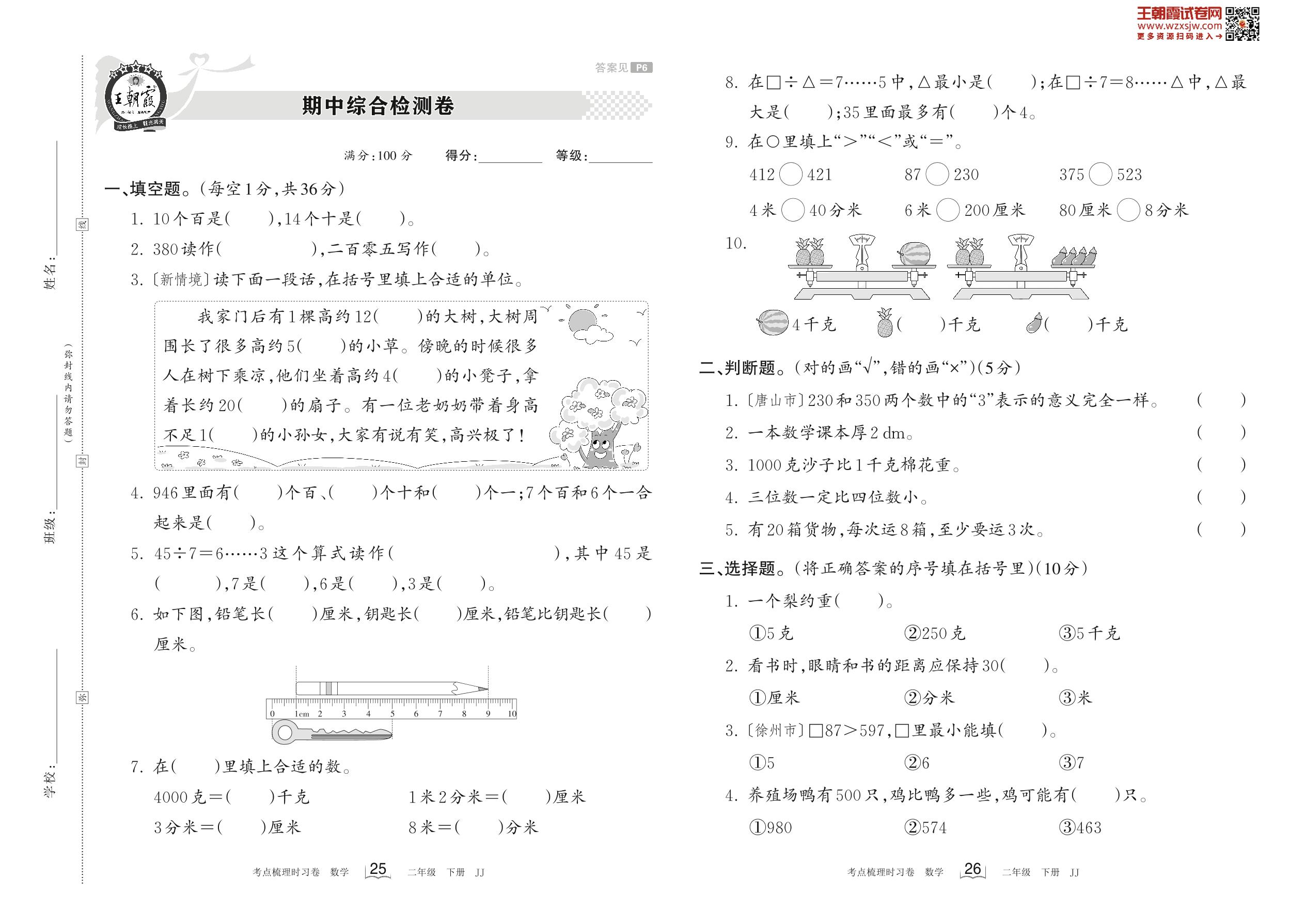 2023下册二年级数学冀教版 期中综合检测卷