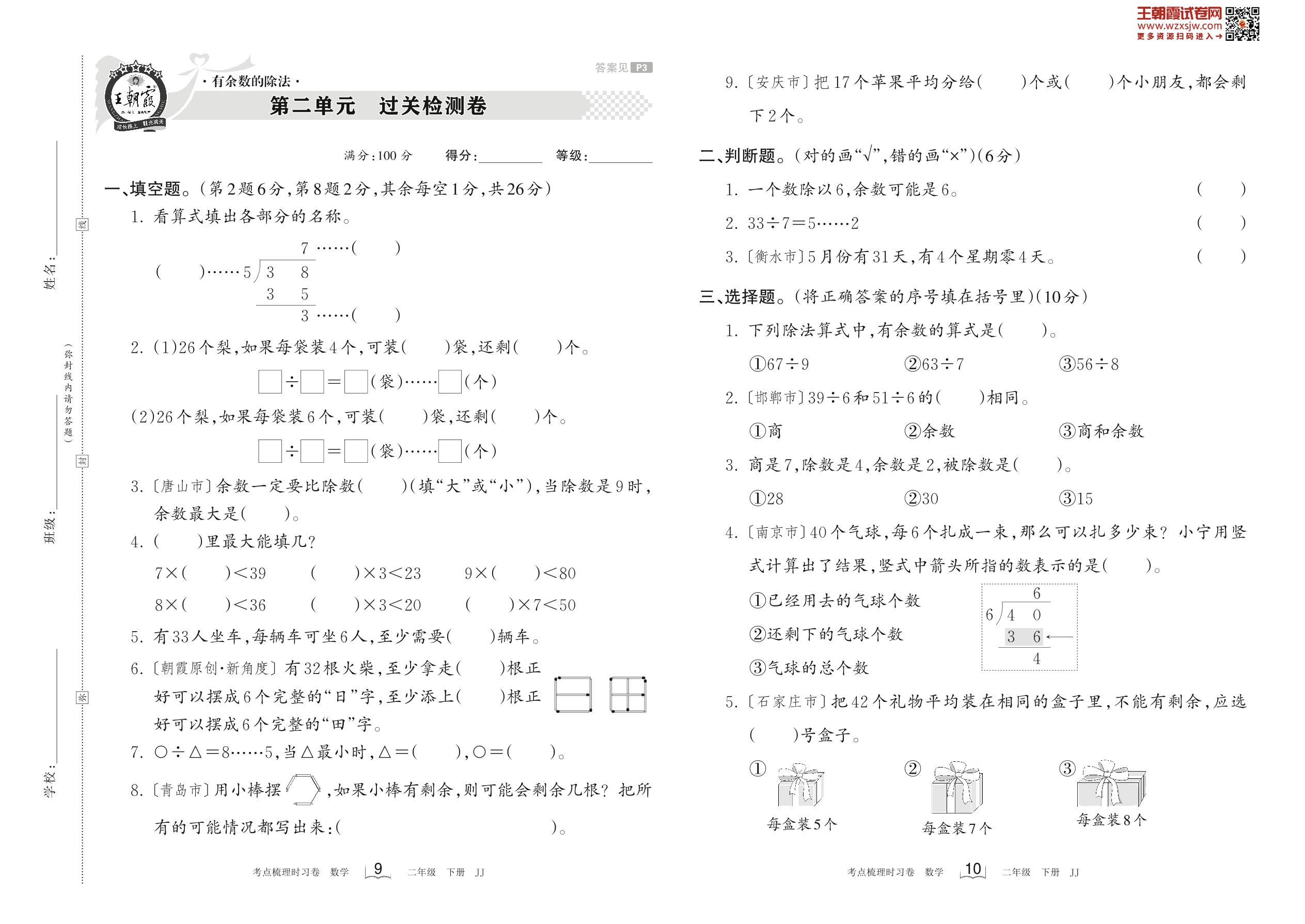 2023下册二年级数学冀教版 第二单元 过关检测卷