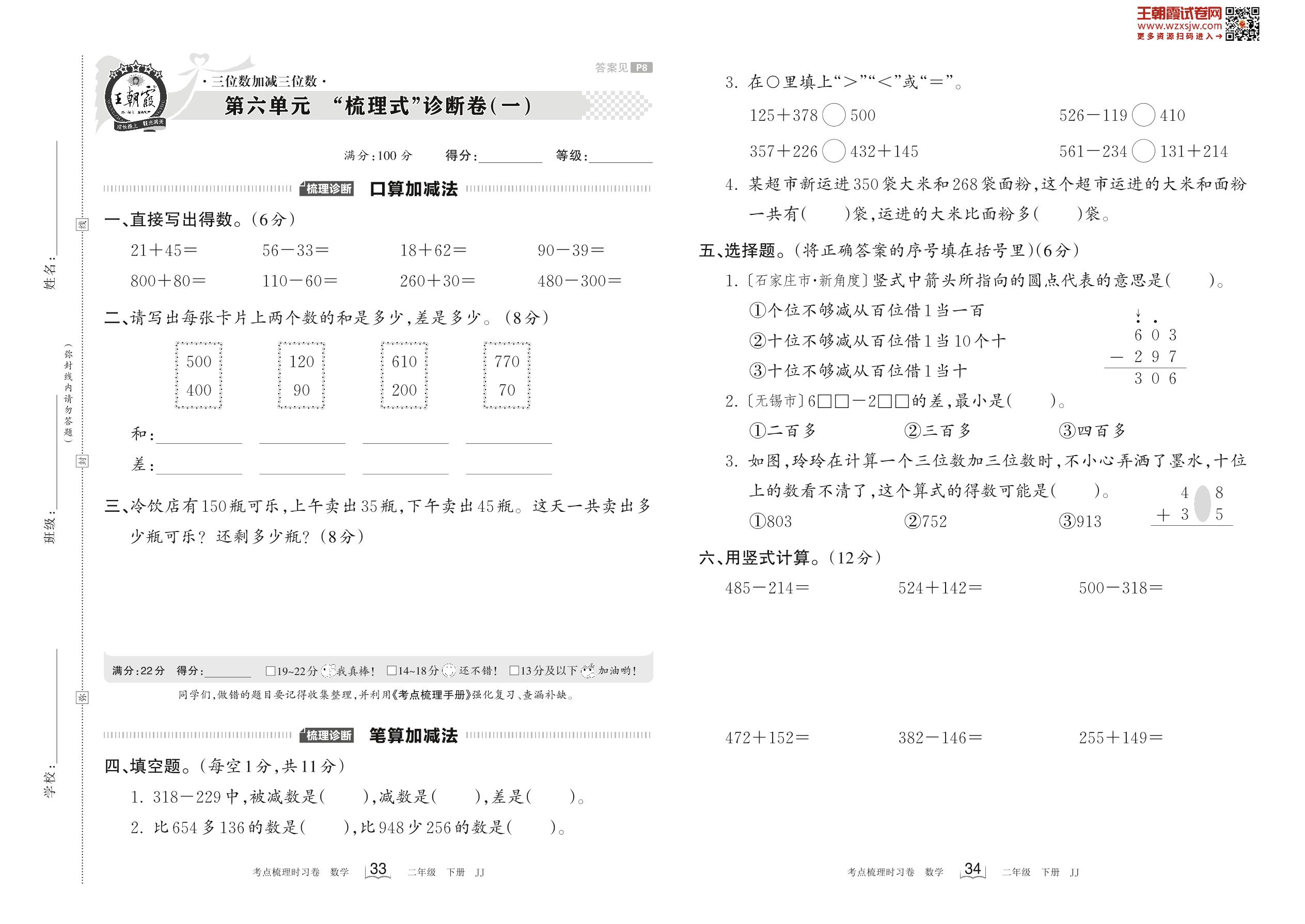 2023下册二年级数学冀教版 第六单元 “梳理式”诊断卷(一)