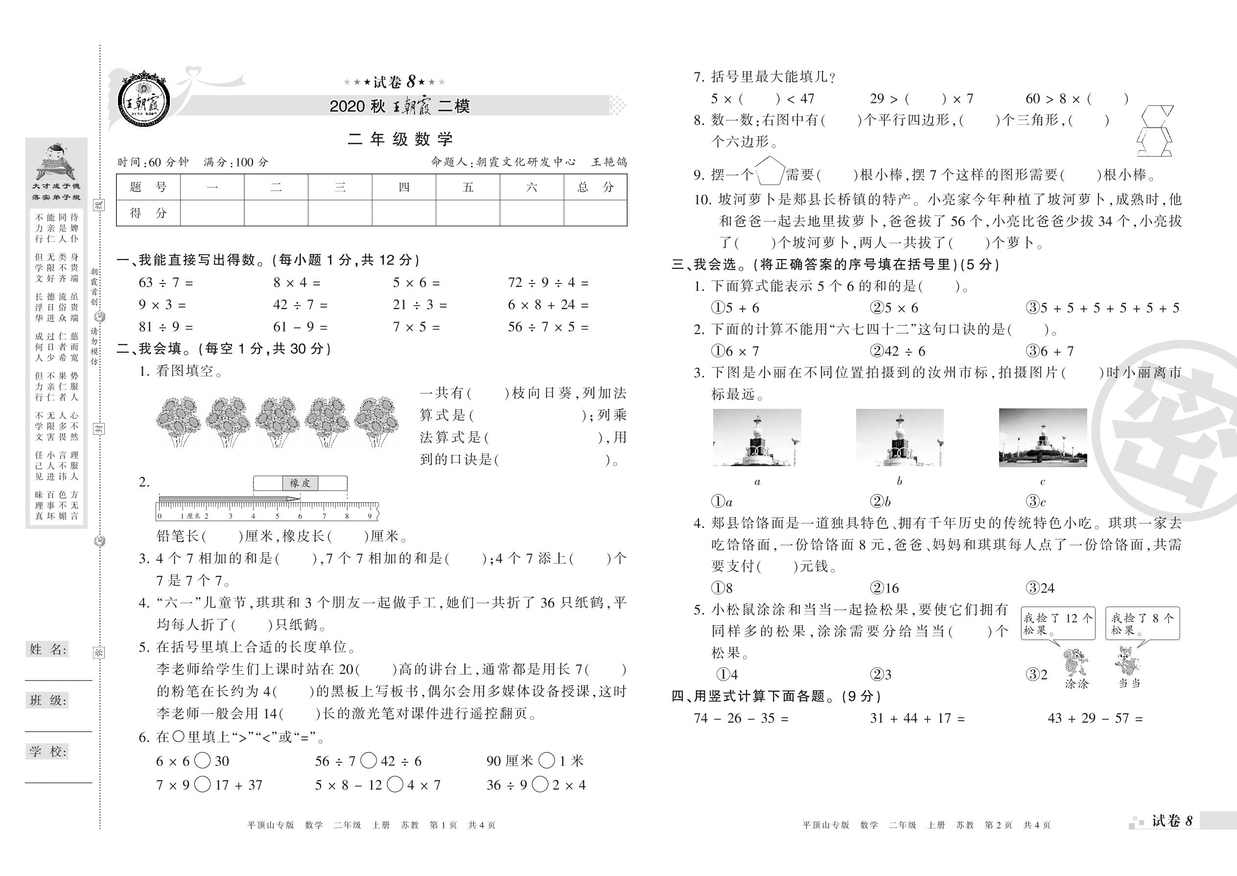 王朝霞期末模拟卷二年级上册数学(苏教版)_R210802211455【8】