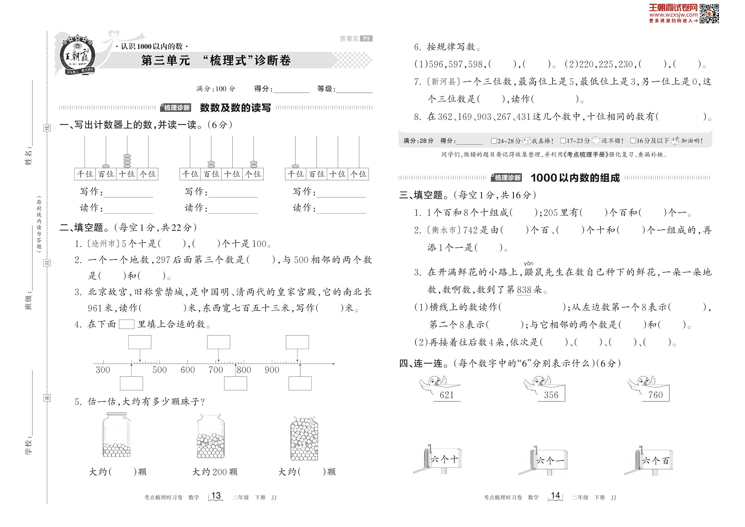 2023下册二年级数学冀教版 第三单元 “梳理式”诊断卷