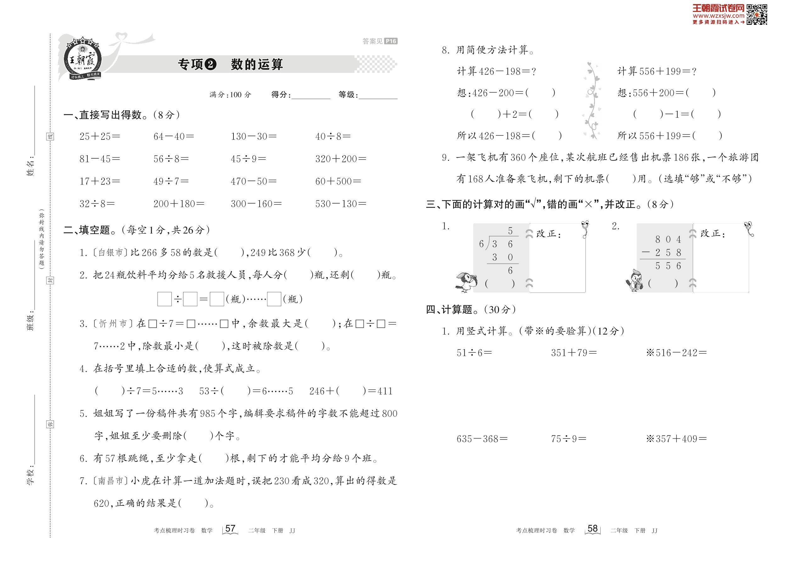 二年级数学冀教版下册专项卷