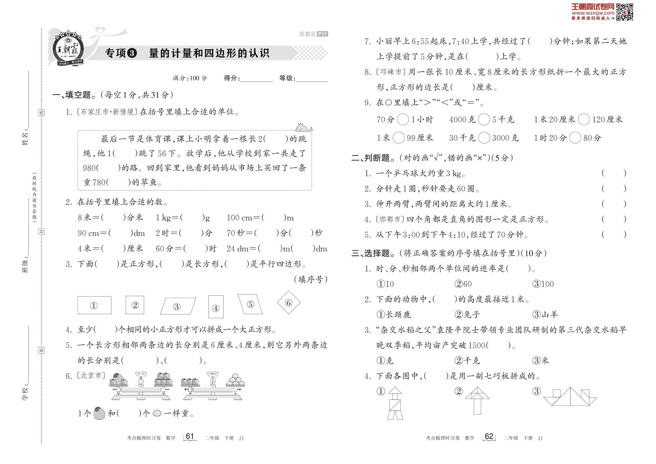 2023下册二年级数学冀教版 专项3 量的计量和四边形的认识