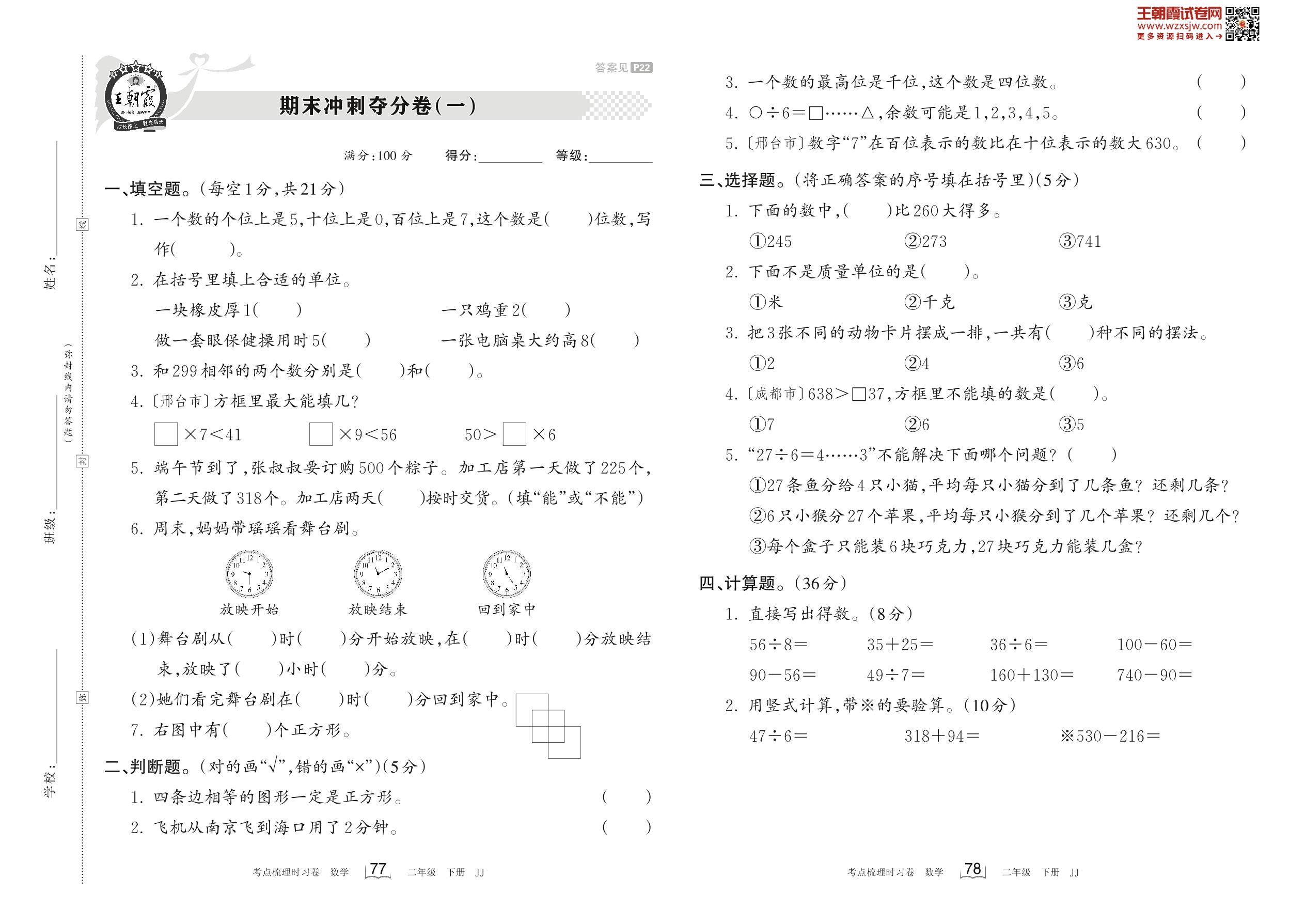 2023下册二年级数学冀教版 期末冲刺夺分卷(一)