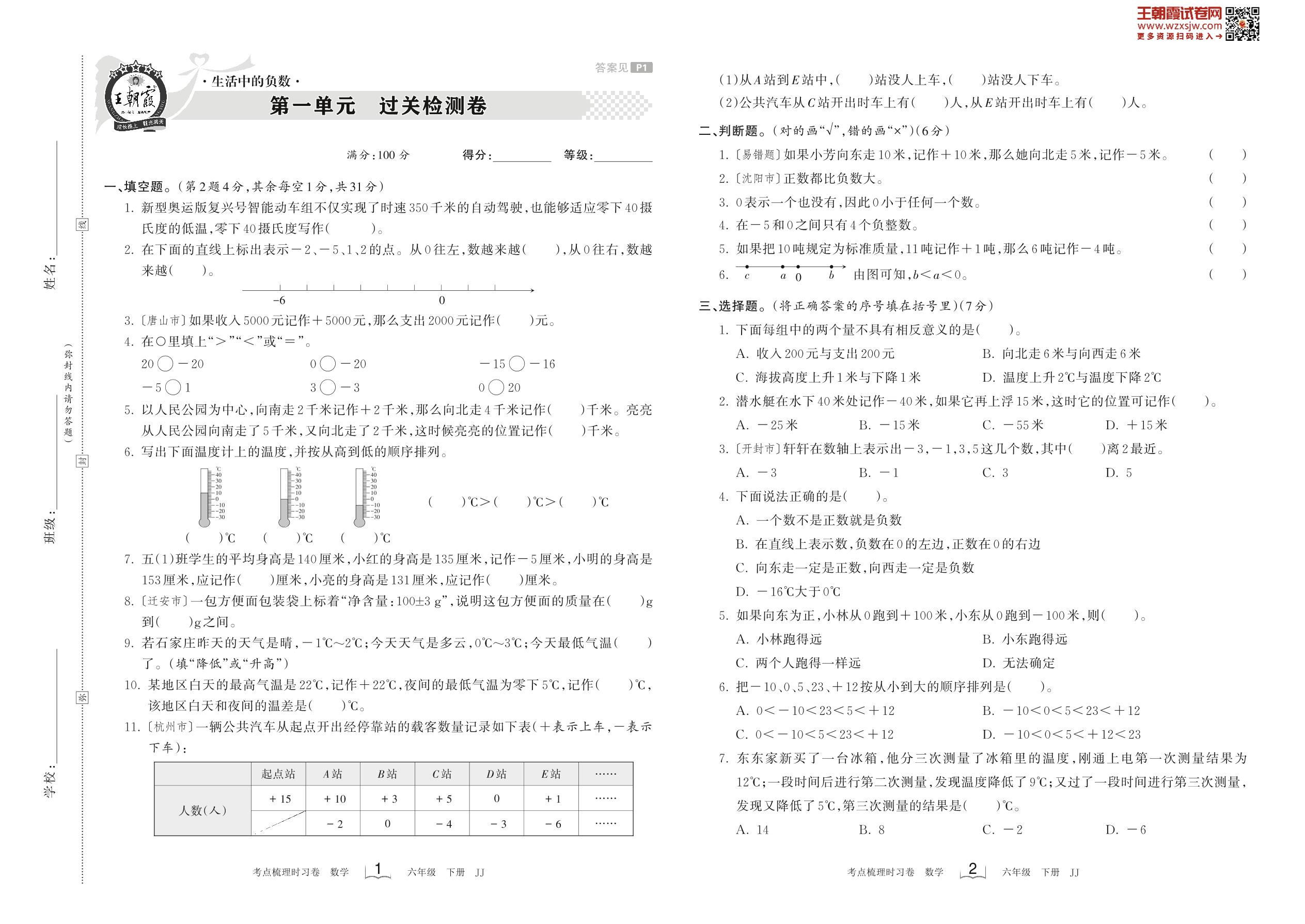 2023下册六年级数学冀教版 第一单元 过关检测卷