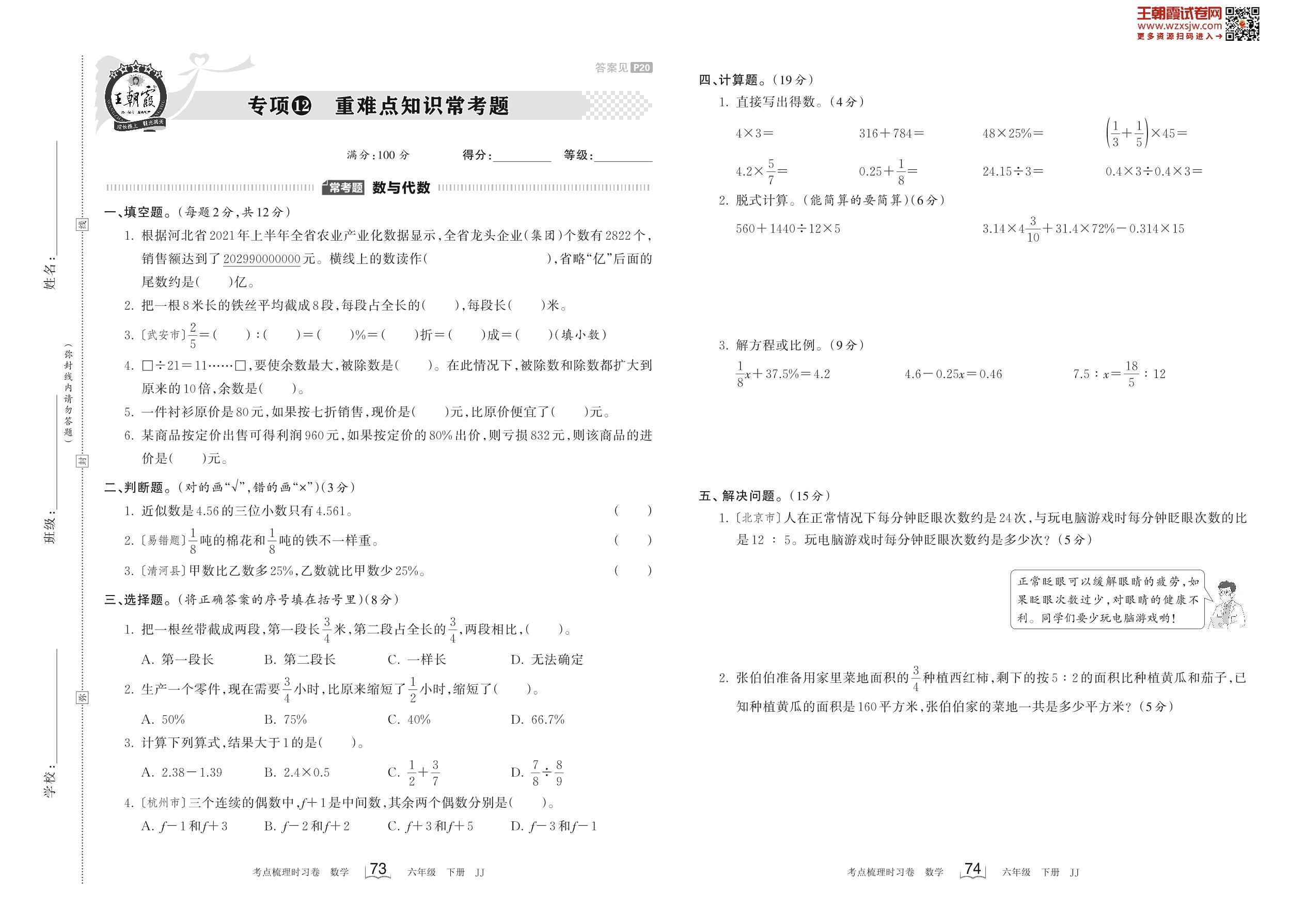 2023下册六年级数学冀教版 专项12 重难点知识常考题