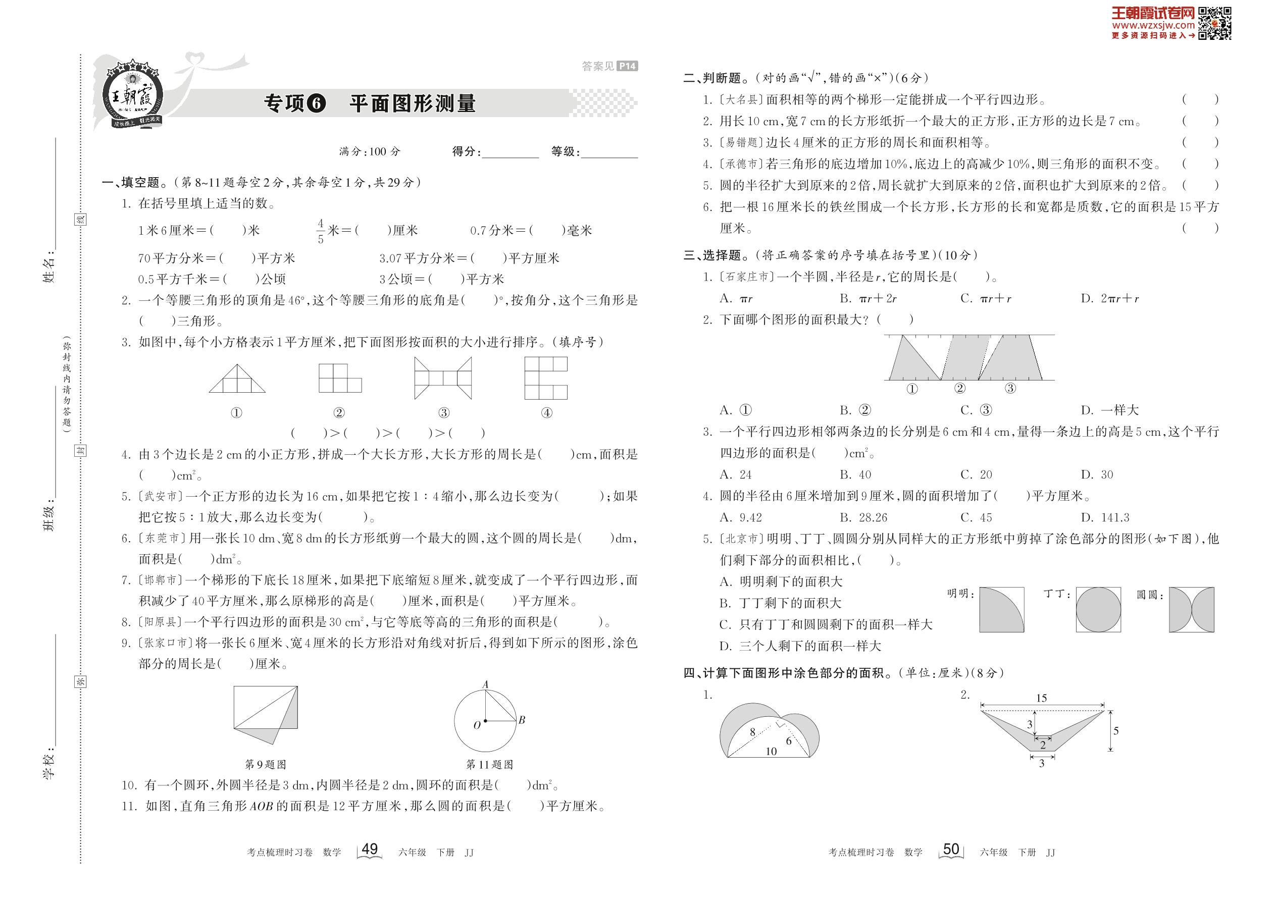 2023下册六年级数学冀教版 专项6 平面图形测量