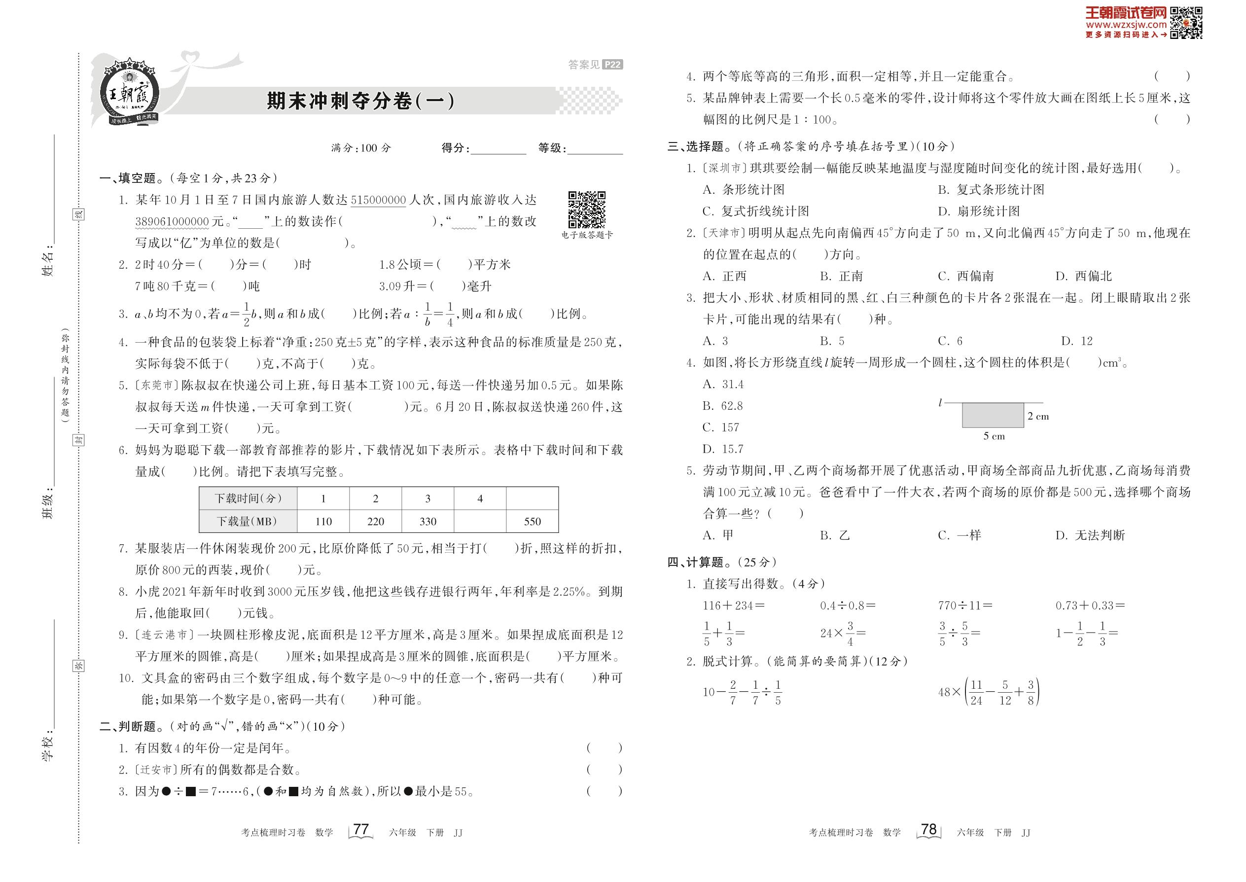 2023下册六年级数学冀教版 期末冲刺夺分卷(一)