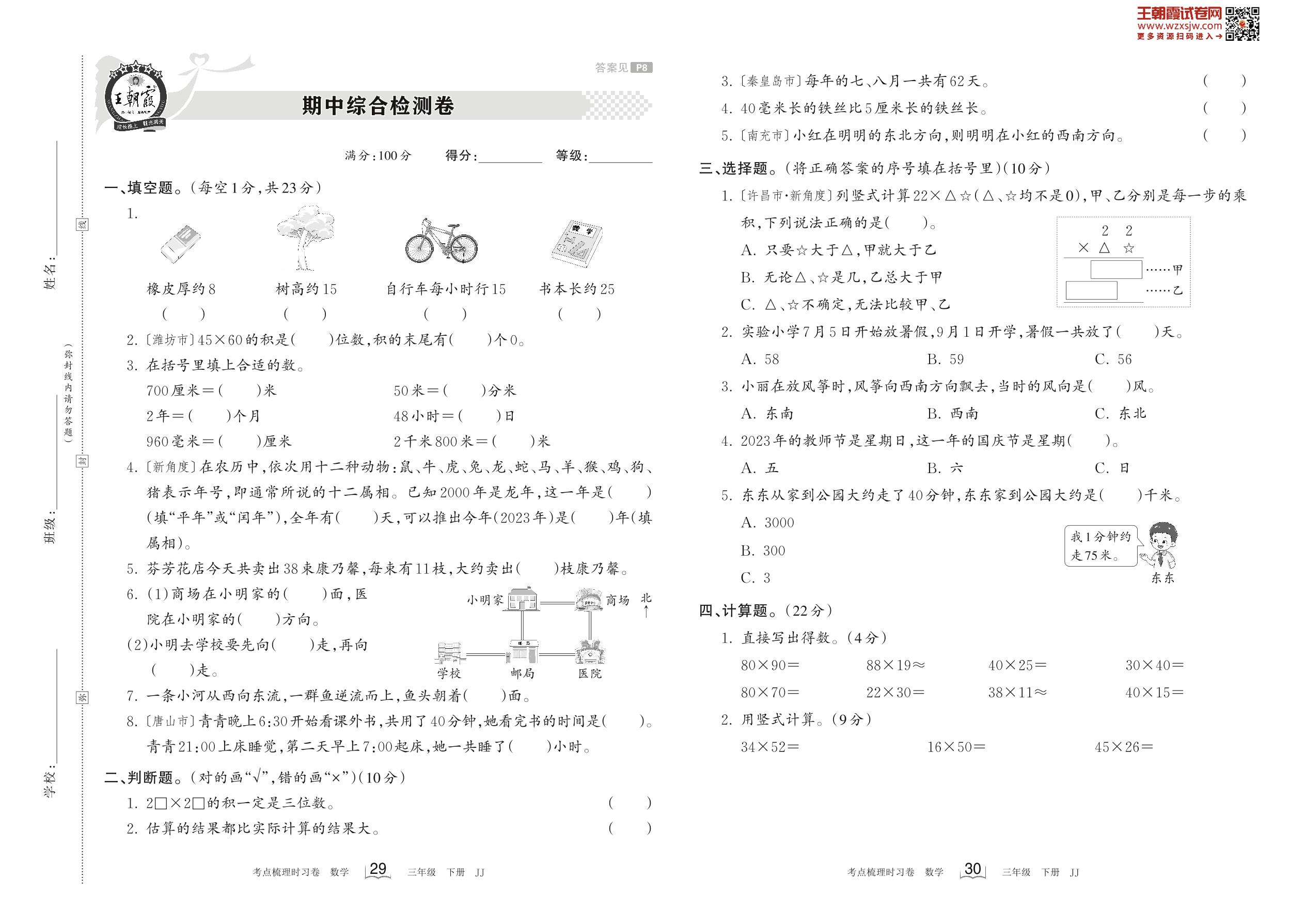 2023下册三年级数学冀教版 期中综合检测卷