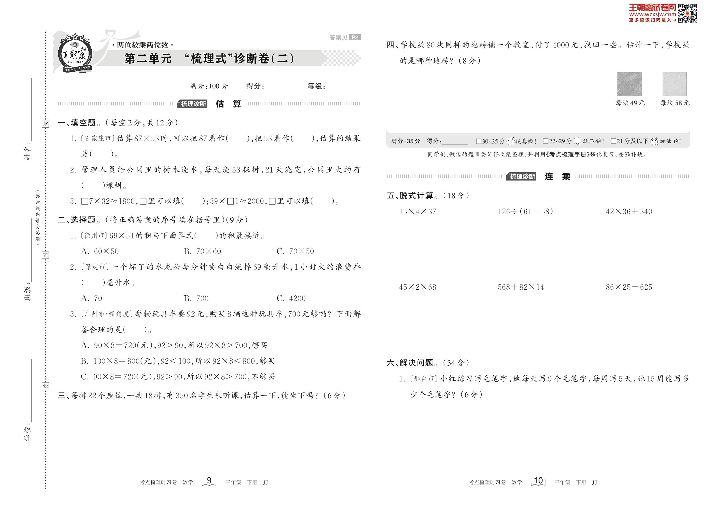 2023下册三年级数学冀教版 第二单元 “梳理式”诊断卷(二)