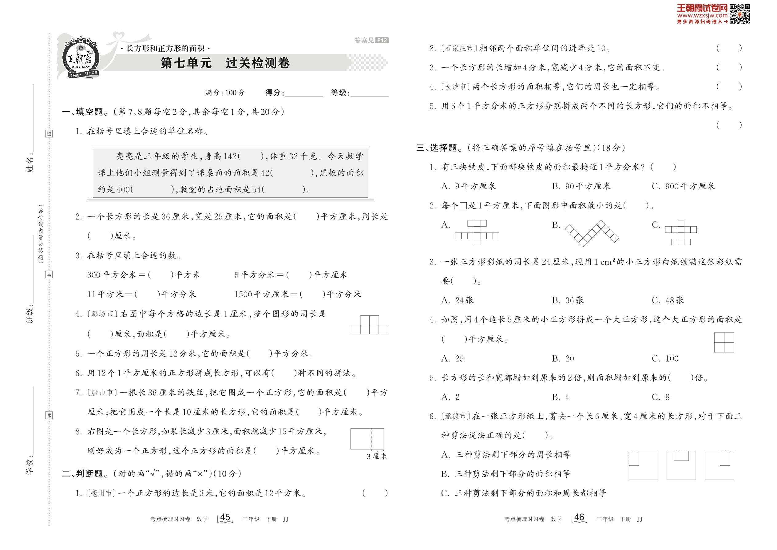 2023下册三年级数学冀教版 第七单元 过关检测卷