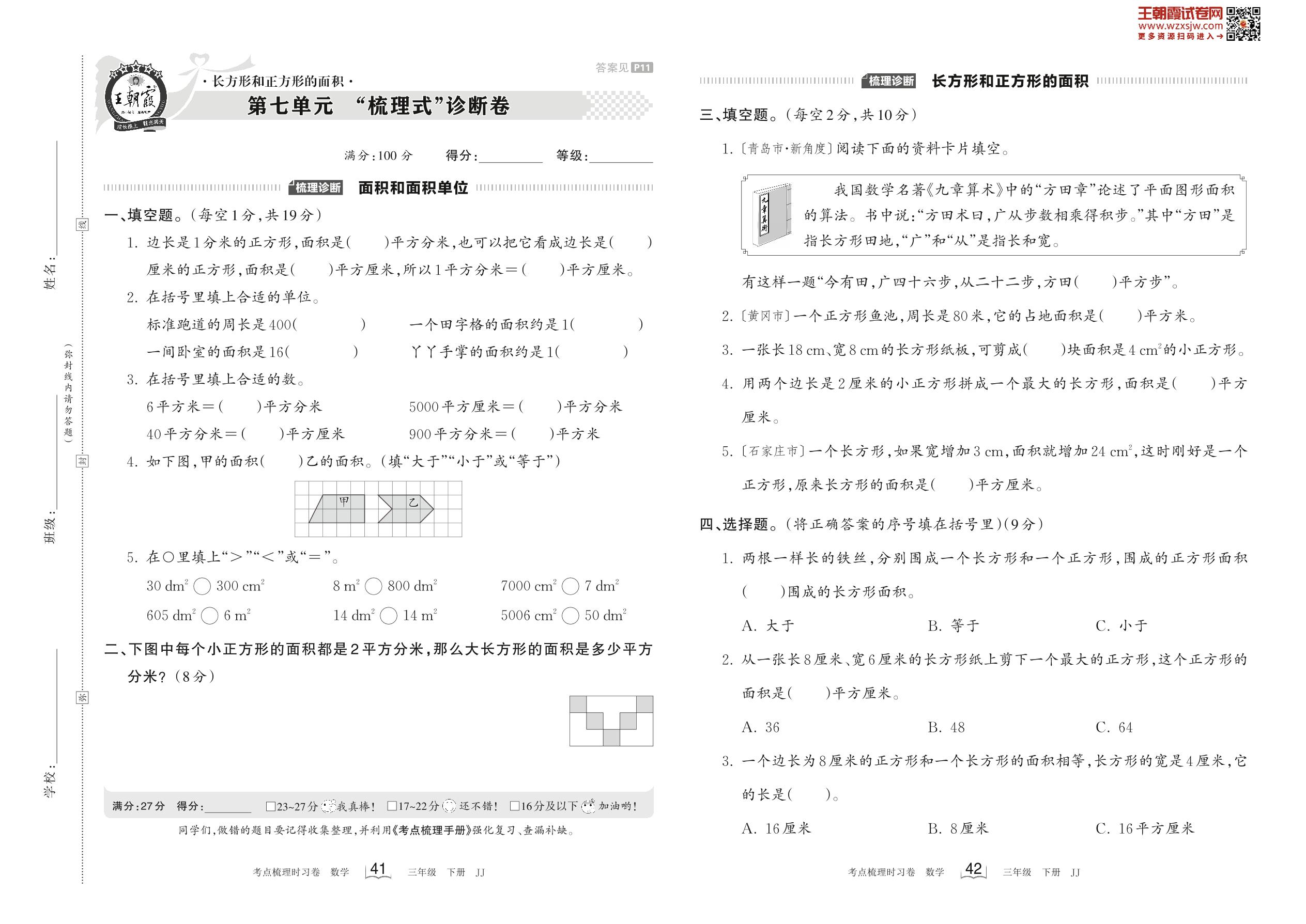 2023下册三年级数学冀教版 第七单元 “梳理式”诊断卷