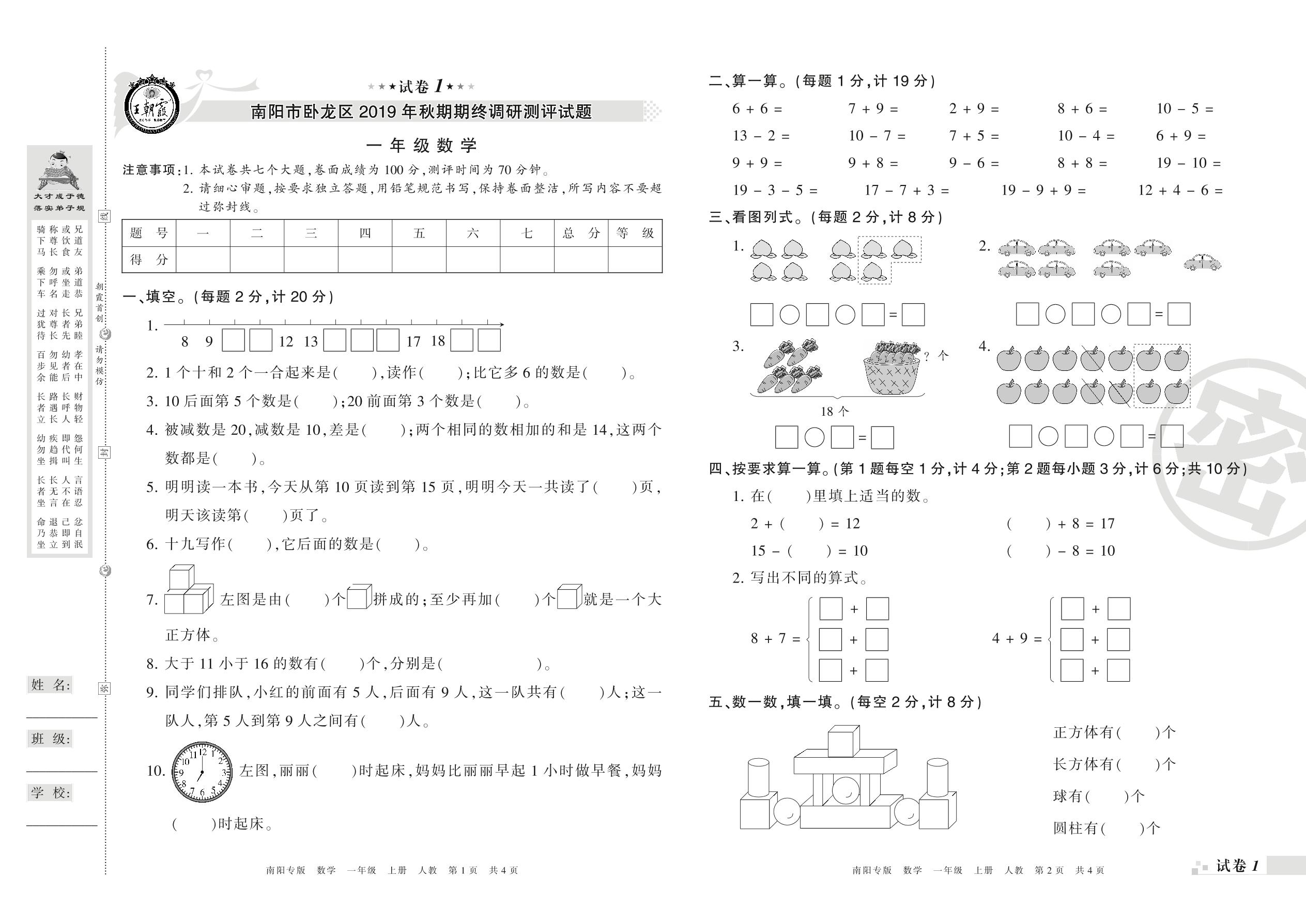 2019-2020学年第一学期南阳市卧龙区一年级数学试卷(人教版)【1】