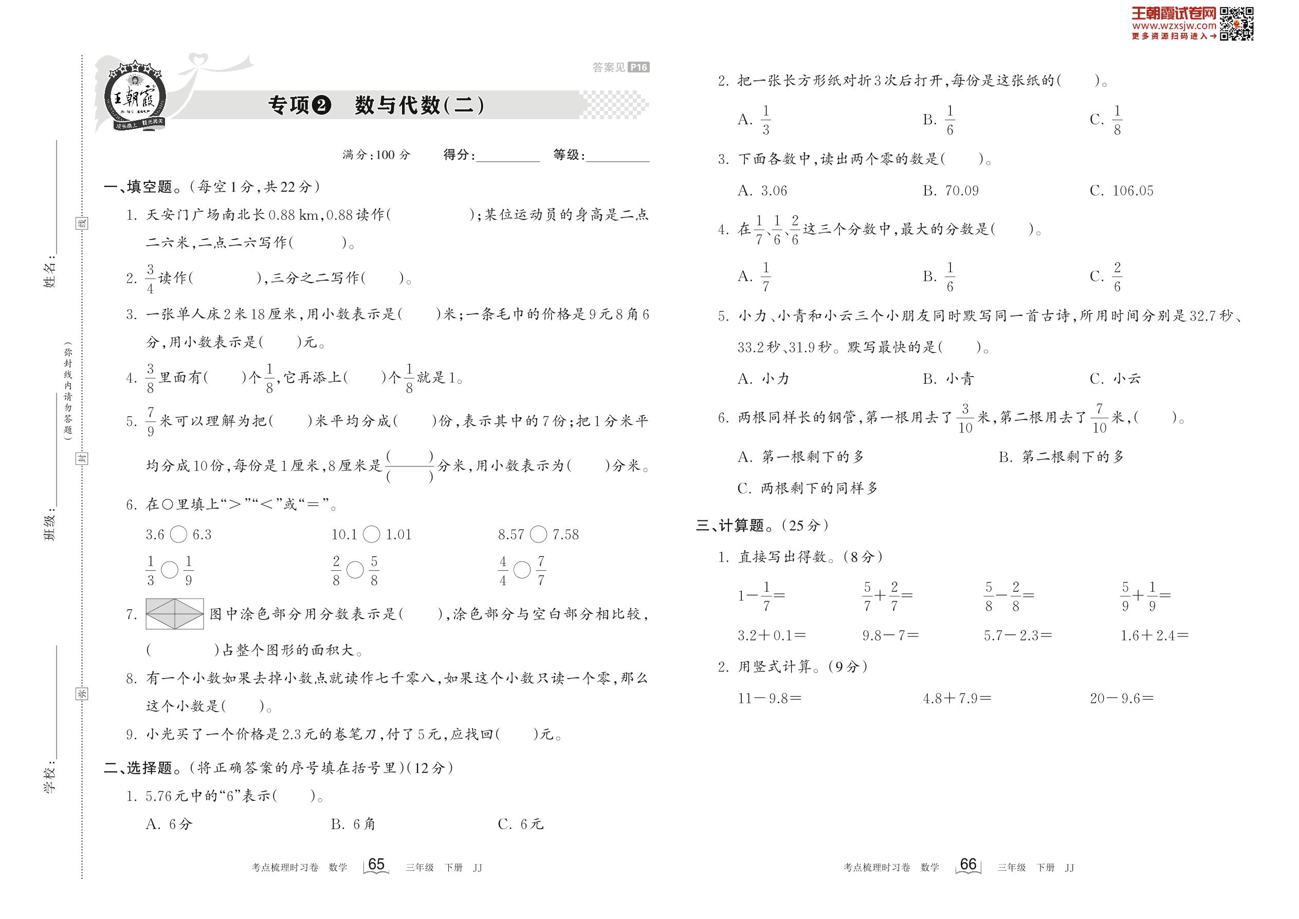 2023下册三年级数学冀教版 专项2 数与代数(二)