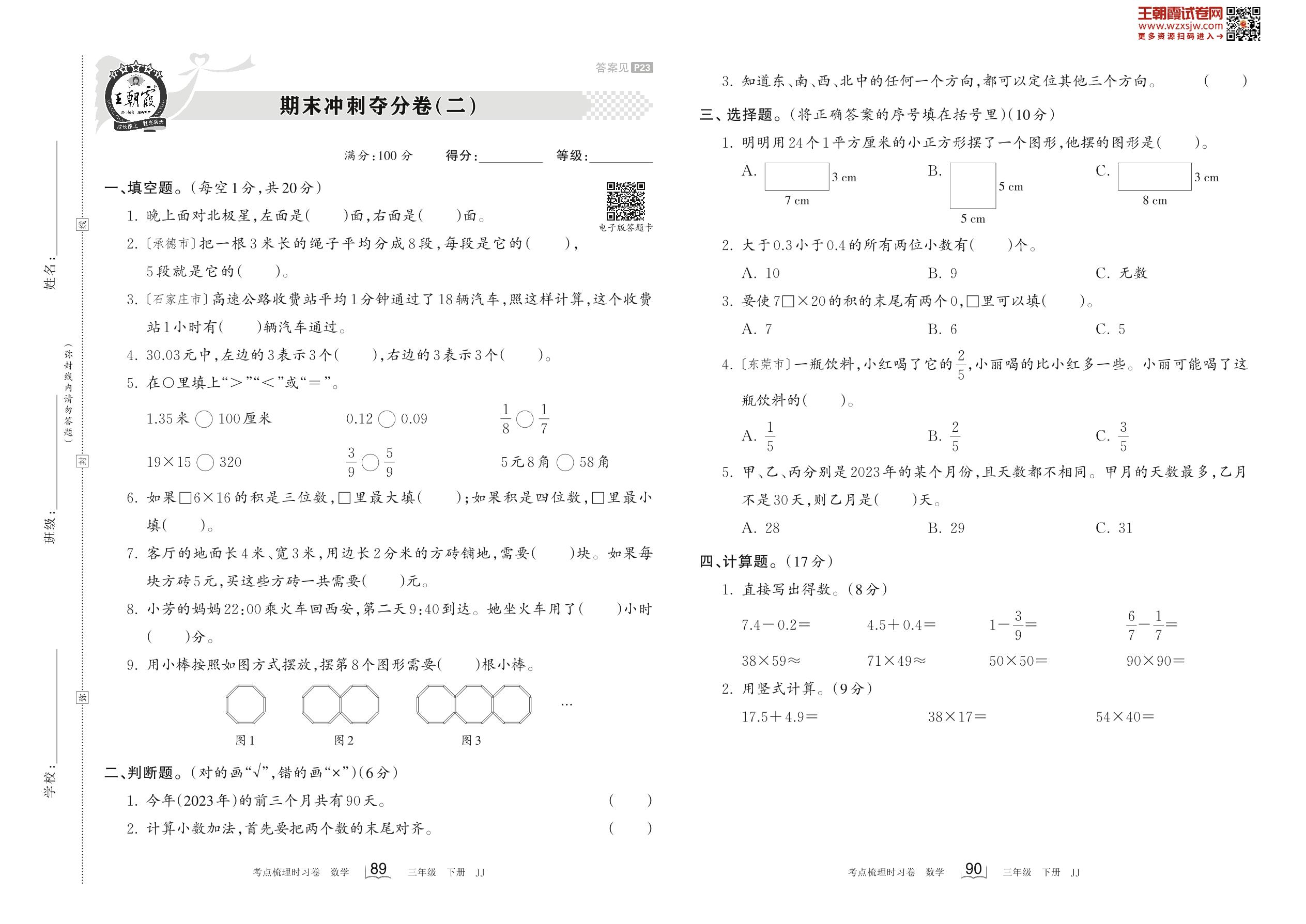 2023下册三年级数学冀教版 期末冲刺夺分卷(二)
