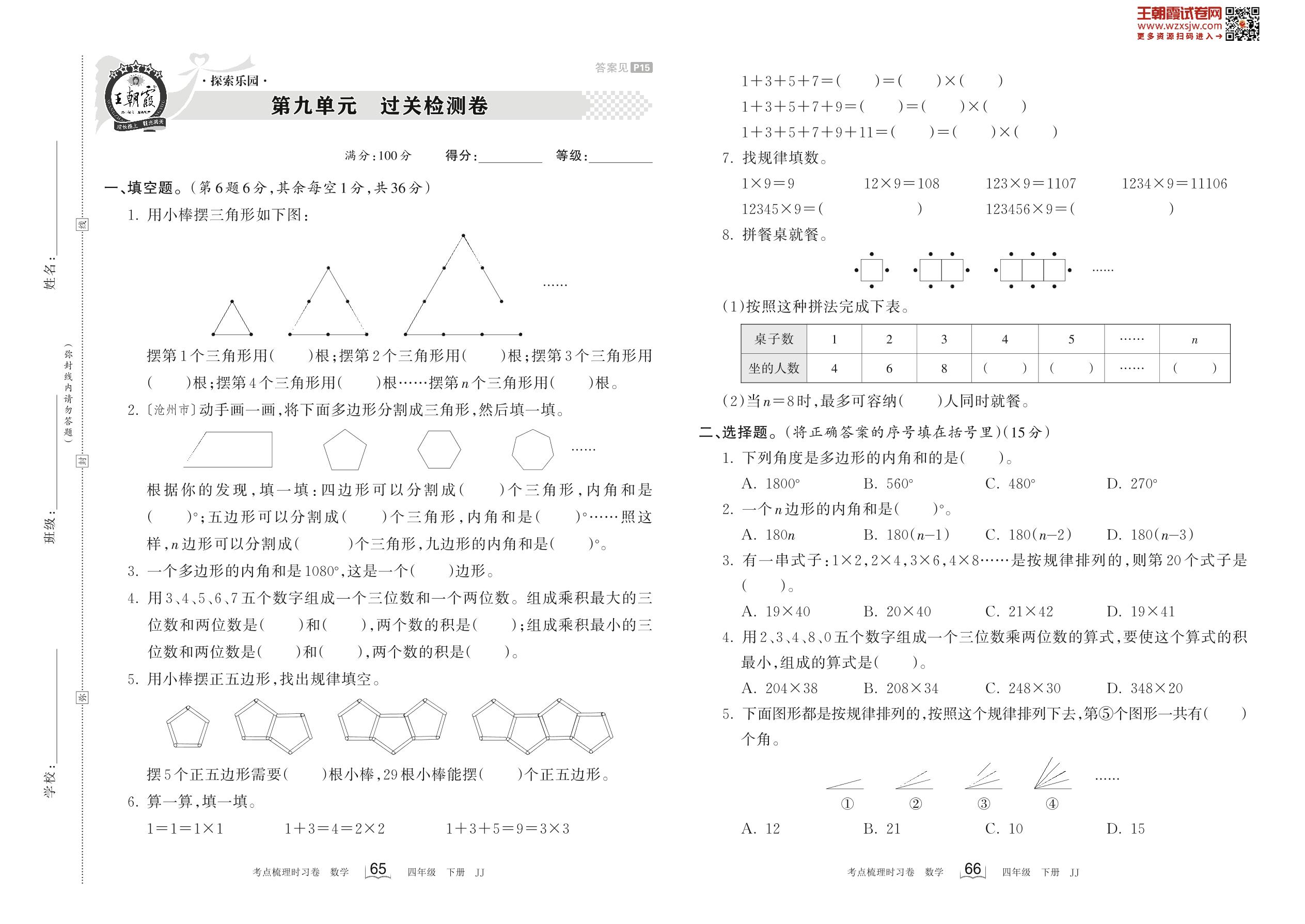 2023下册四年级数学冀教版 第九单元 过关检测卷