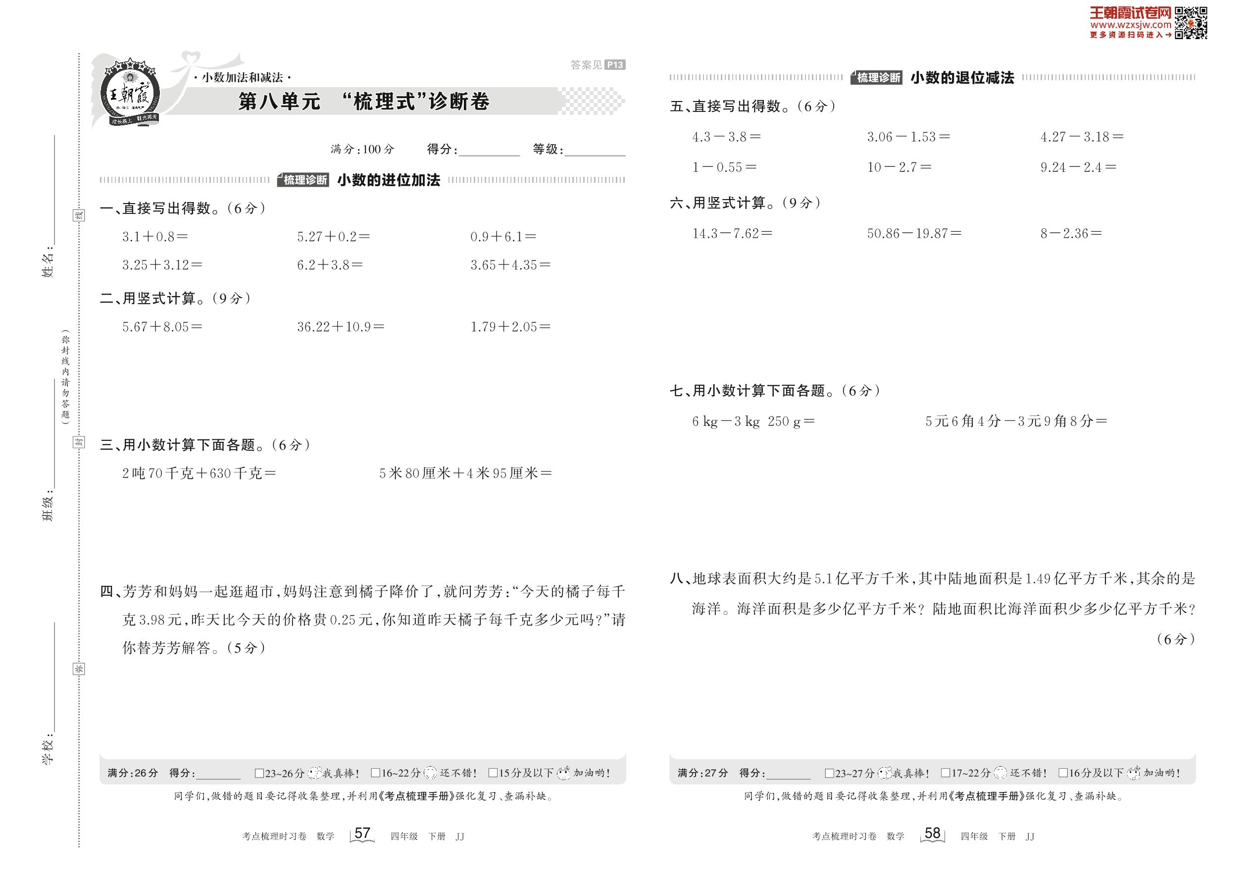 2023下册四年级数学冀教版 第八单元 “梳理式”诊断卷