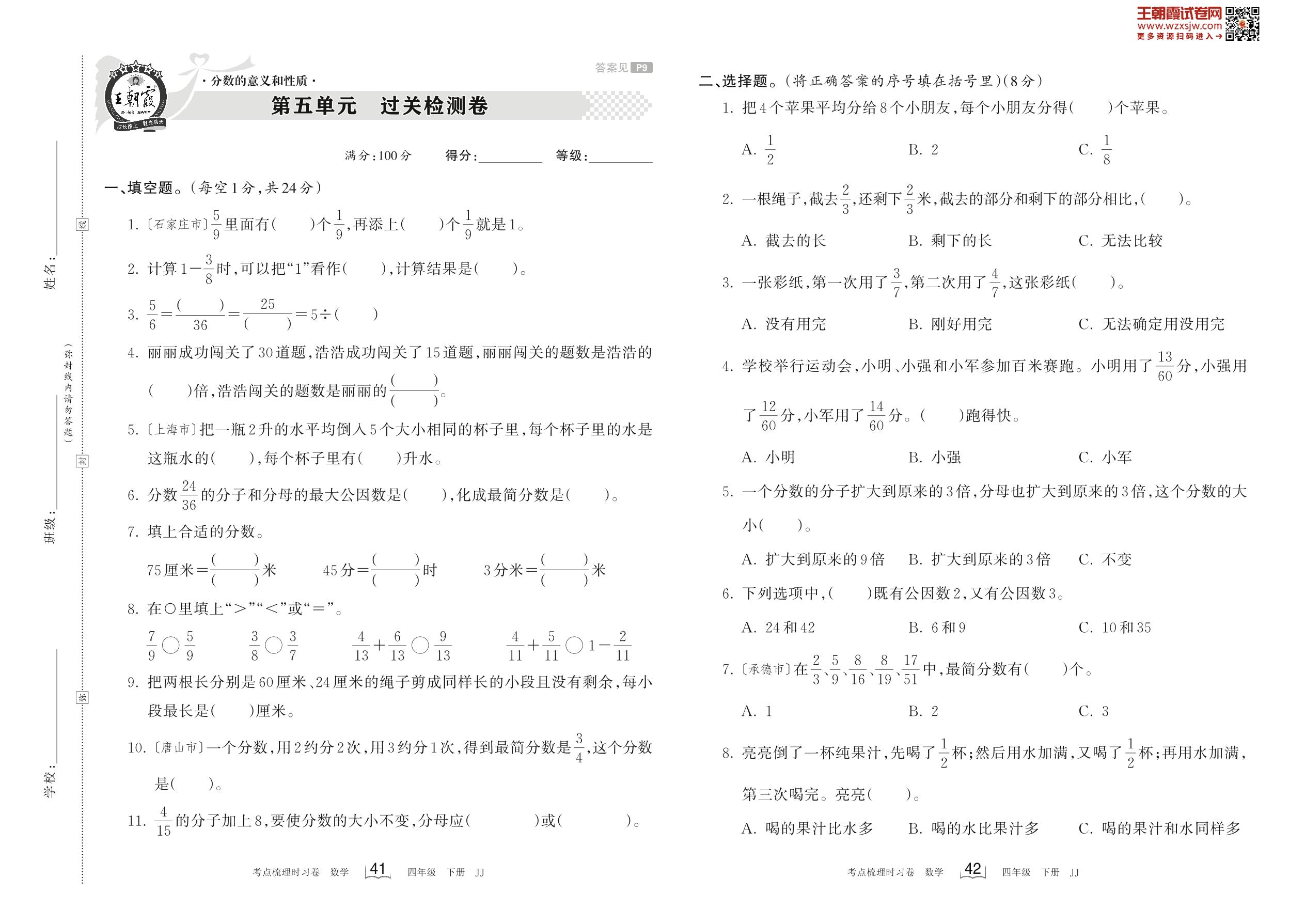 2023下册四年级数学冀教版 第五单元 过关检测卷