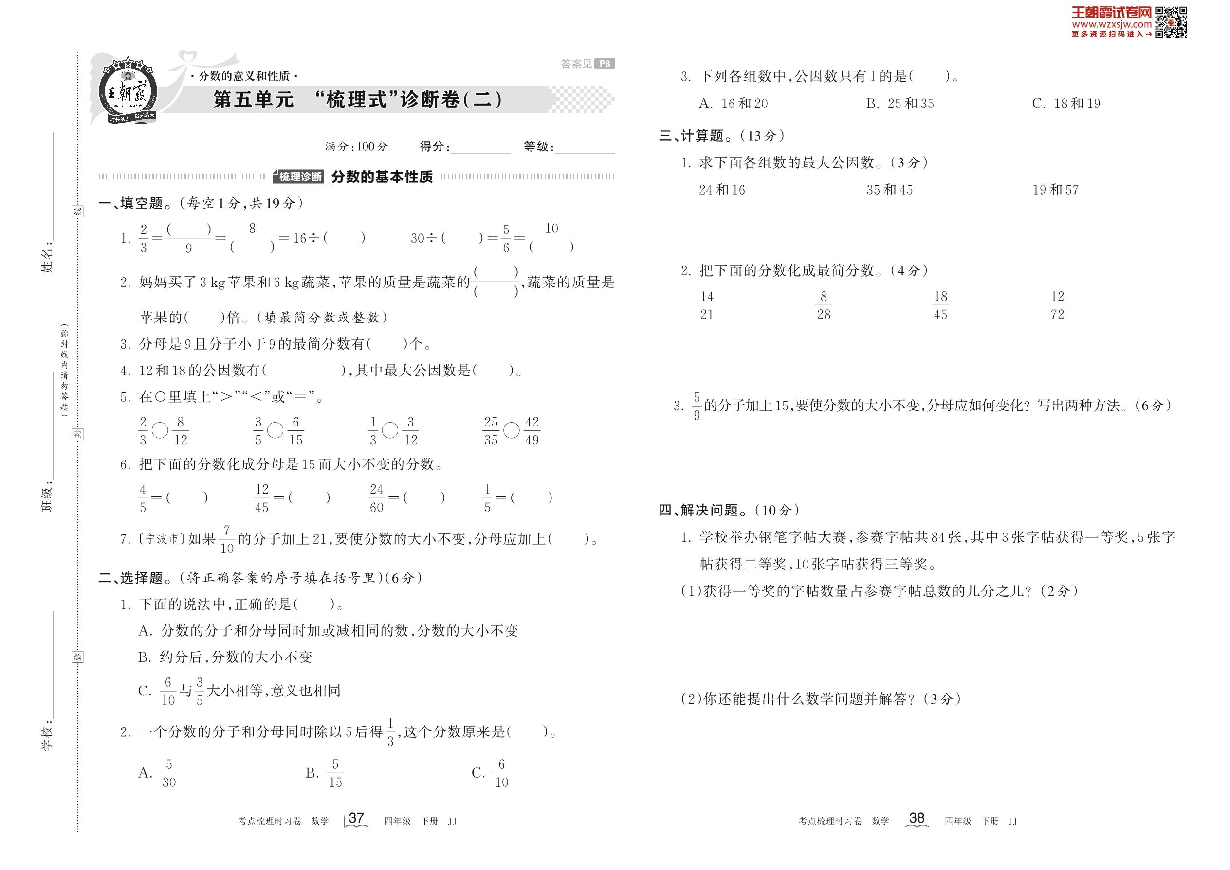 2023下册四年级数学冀教版 第五单元 “梳理式”诊断卷(二)