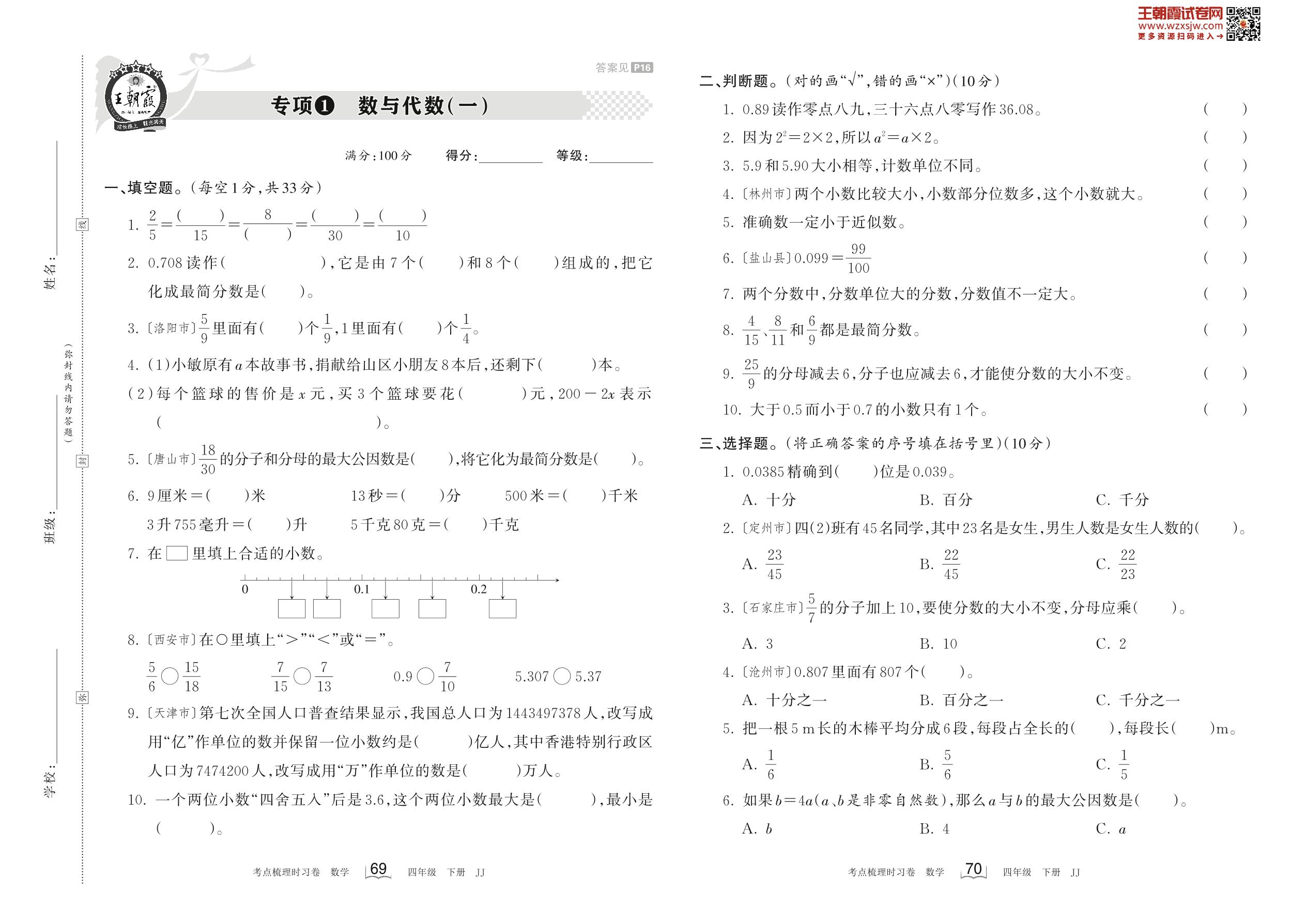2023下册四年级数学冀教版 专项1 数与代数(一)