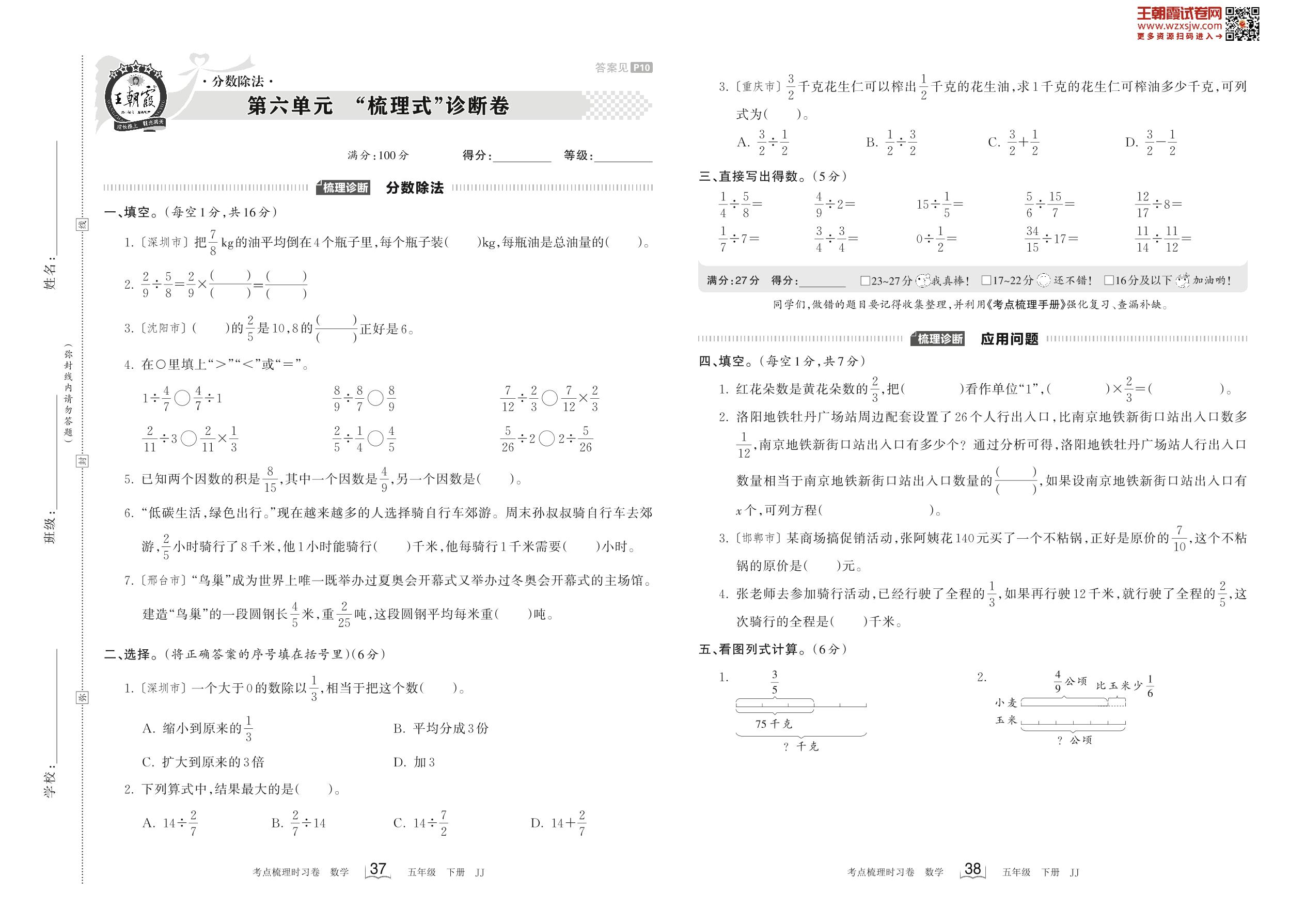 2023下册五年级数学冀教版 第六单元 “梳理式”诊断卷