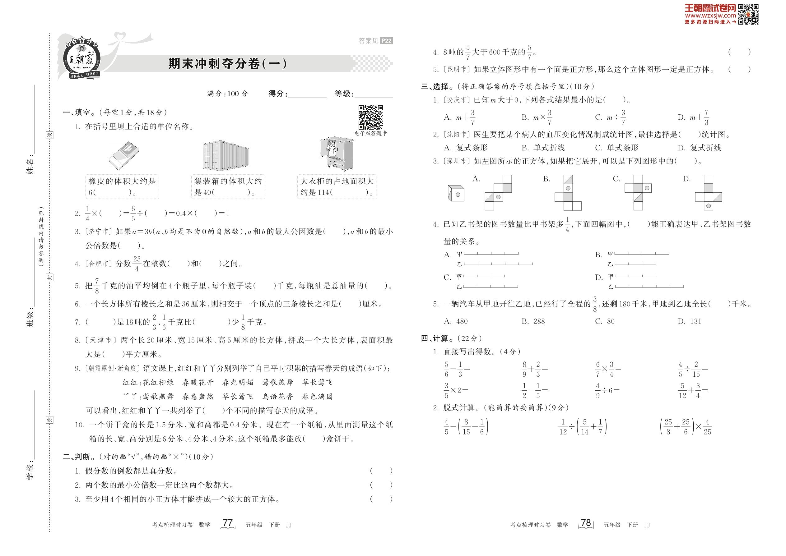 2023下册五年级数学冀教版 期末冲刺夺分卷(一)