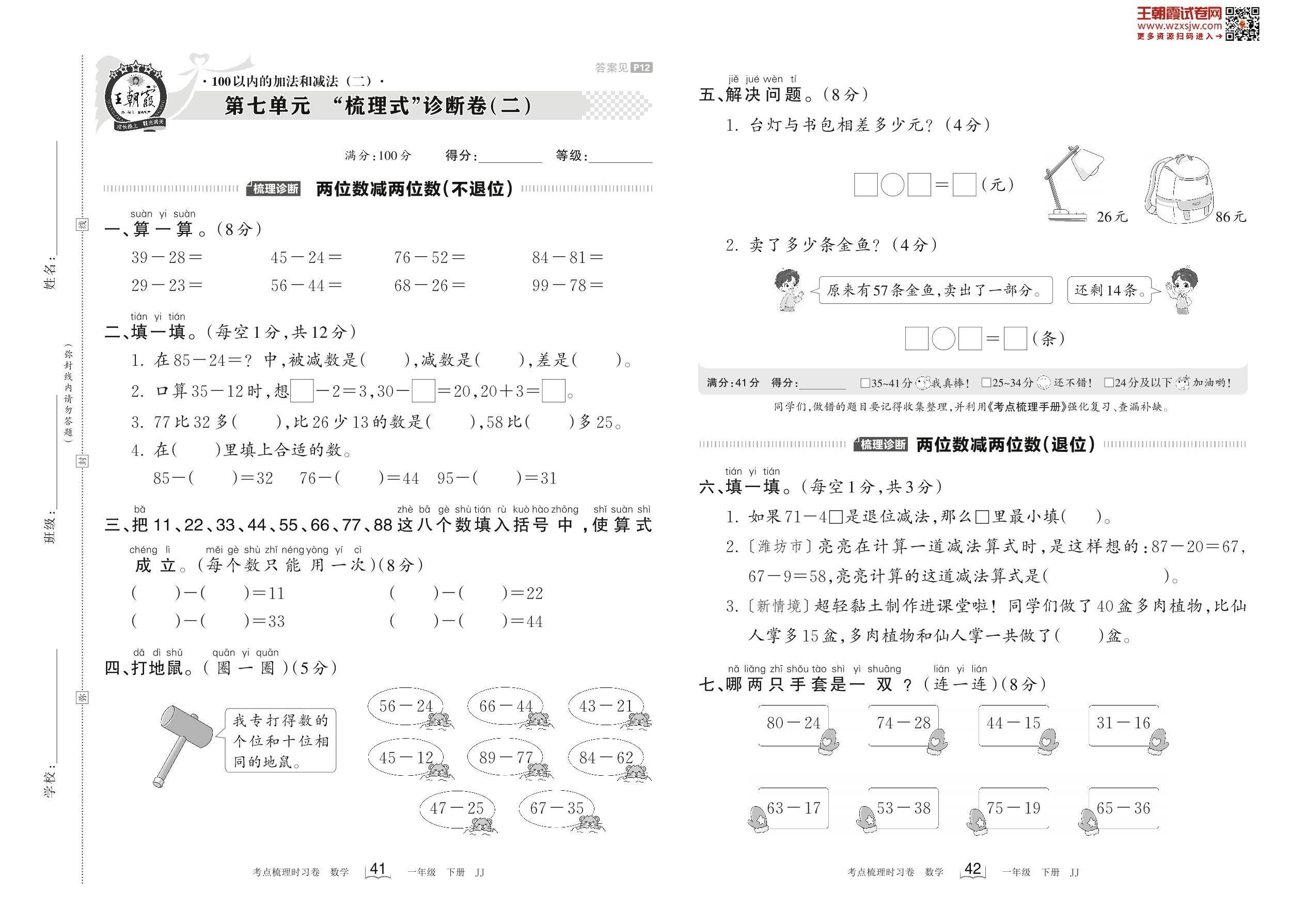 2023下册一年级数学冀教版 第七单元 “梳理式”诊断卷(二)
