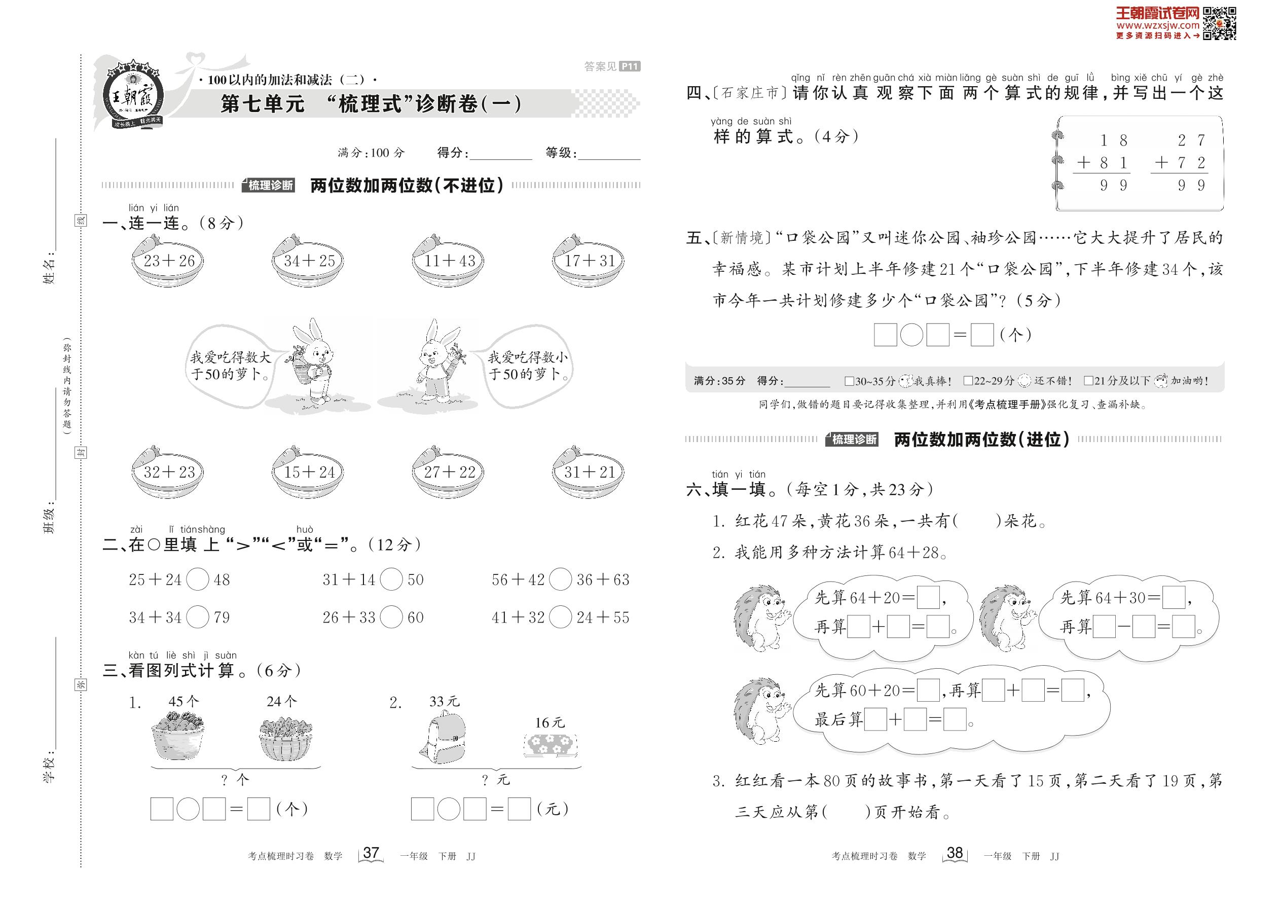 2023下册一年级数学冀教版 第七单元 “梳理式”诊断卷(一)