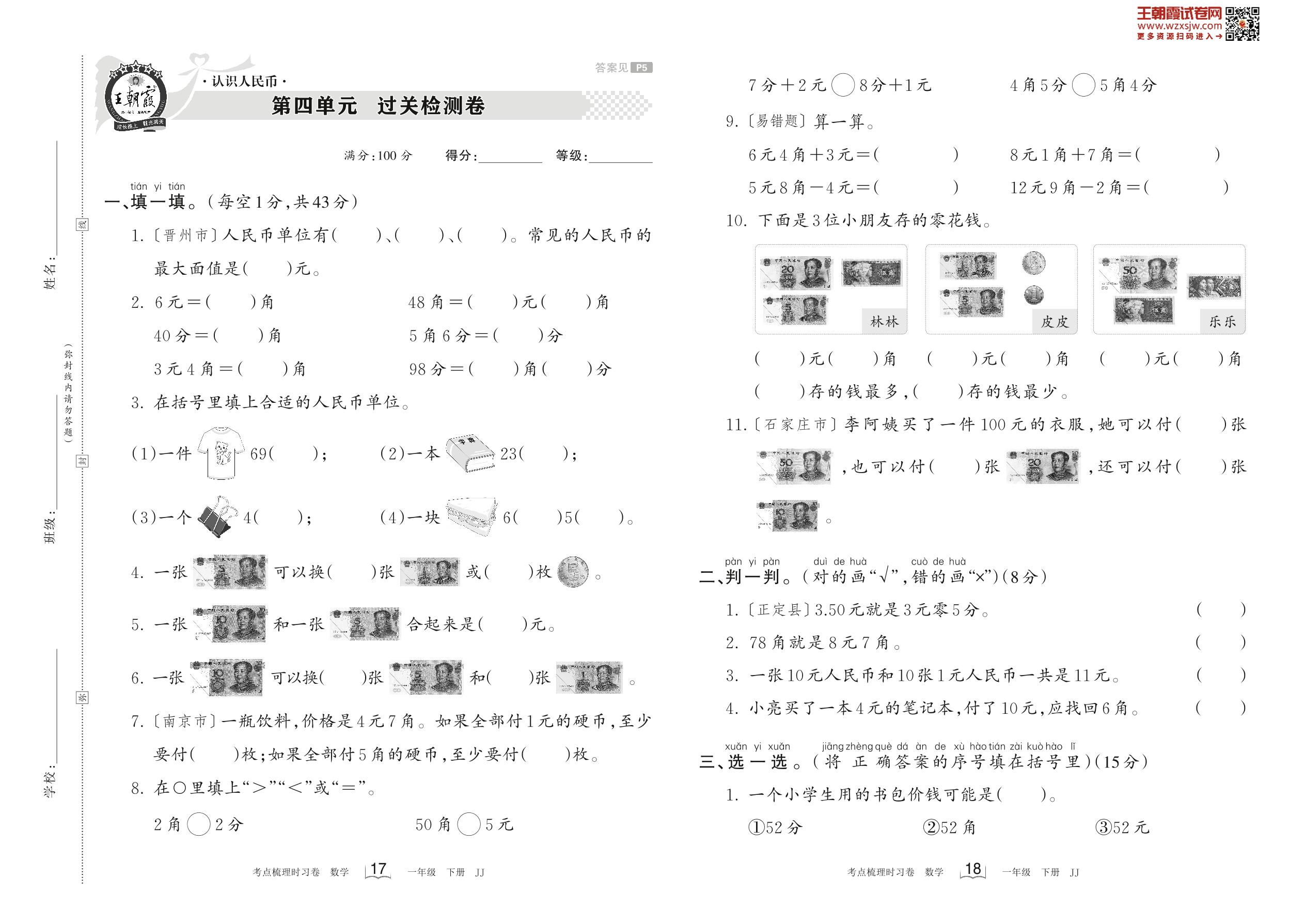 2023下册一年级数学冀教版 第四单元 过关检测卷