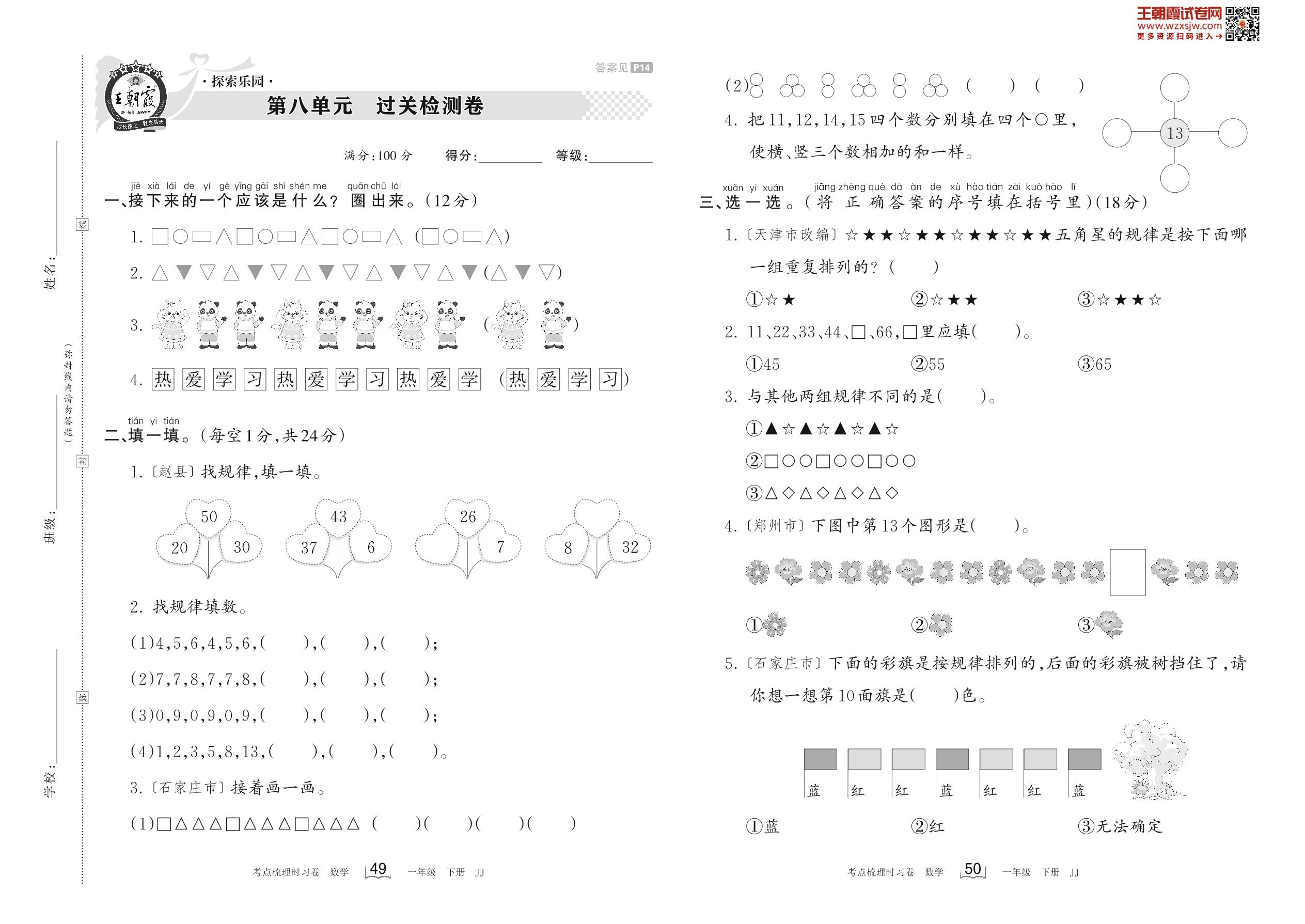 2023下册一年级数学冀教版 第八单元 过关检测卷